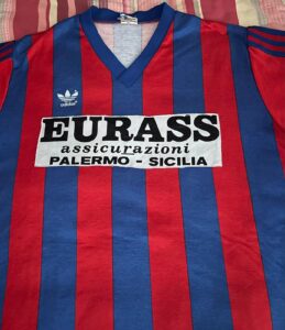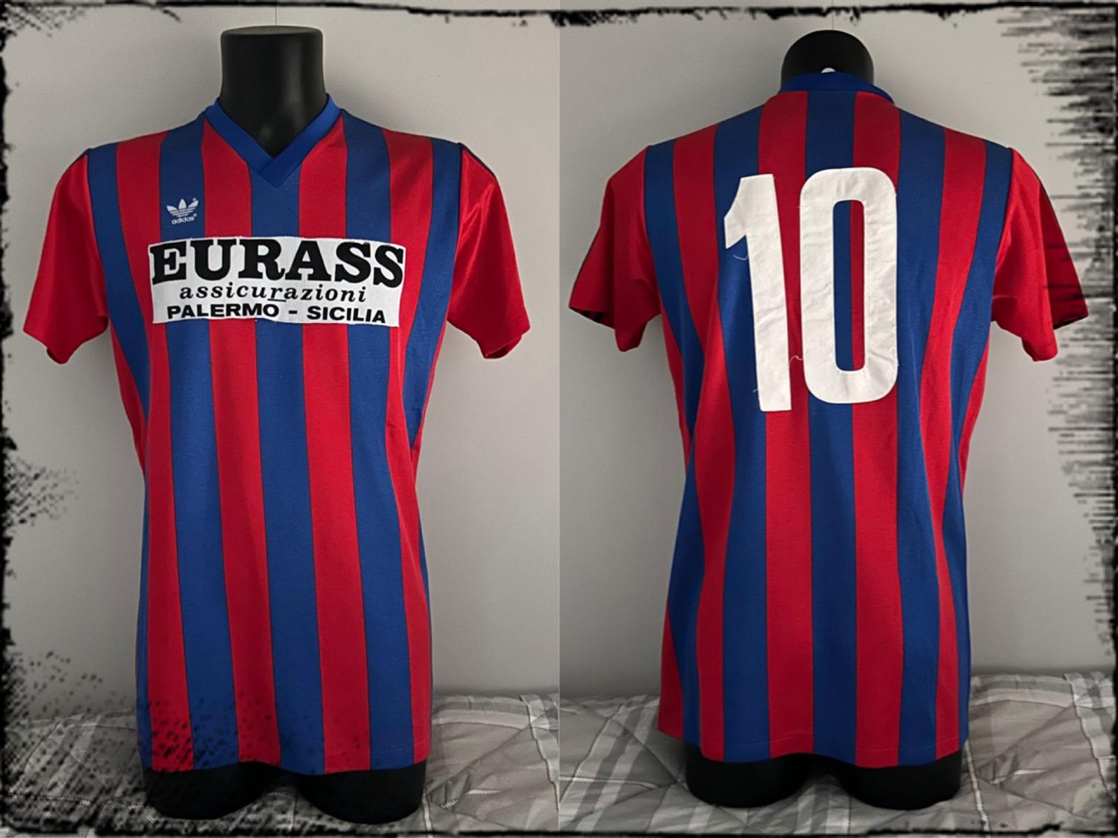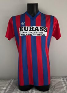 La maglia è un bel modello a manica corta e a strisce verticali, prodotto da Adidas nell’allora Germania Ovest. E’ in tessuto misto (cotone-acrilico) e reca cinque bande verticali blu intervallato da bande rosse, più larghe alle due estremità della maglia. E’ lo stesso modello utilizzato anche dal Cosenza nella stessa stagione, ma anche da altre squadre italiane come Lecce, Lucchese, Ascoli, Vicenza e Barletta per fare qualche esempio concreto. La maglia è senza colletto e reca uno scollo a “v”. Al centro della maglia troviamo lo sponsor commerciale, la compagnia assicurativa “Eurass Assicurazioni” Palermo-Sicilia”. Uno sponsor che fu motivo di contestazione della tifoseria etnea dato che recava sulla maglia; quindi, su ciò che è più sacro per un tifoso, il nome della città e della squadra rivale per eccellenza del Catania, vale a dire il Palermo. Lo sponsor arrivò a stagione in corso, il che rende questa maglia ancora più rara.