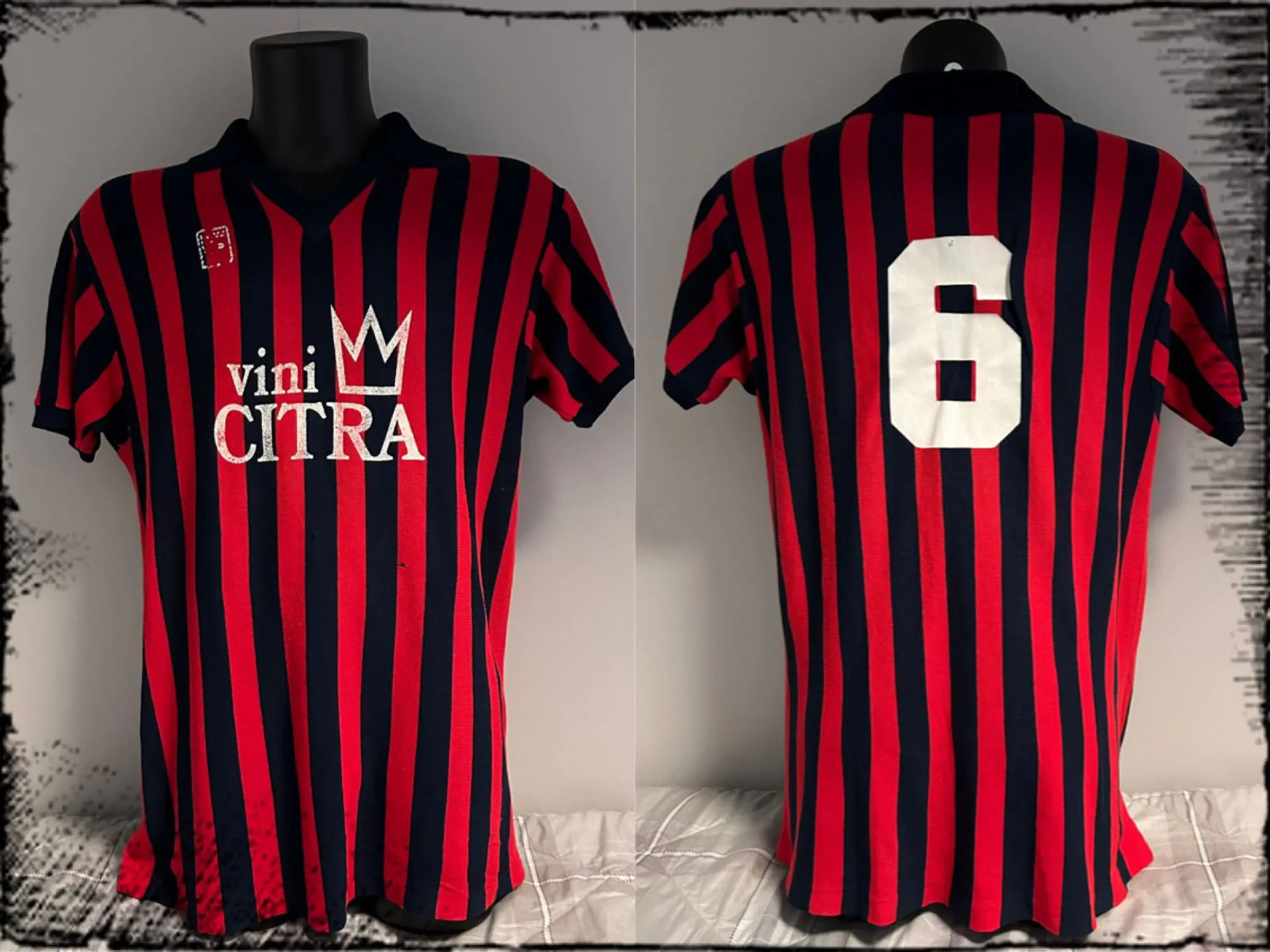 La maglia è a manica corta con strisce rossonere molto strette. A causa dei lavaggi, il logo della Fashion Sport, una “F” stilizzata, risulta parzialmente visibile. Il colletto e i bordi manica sono neri.
