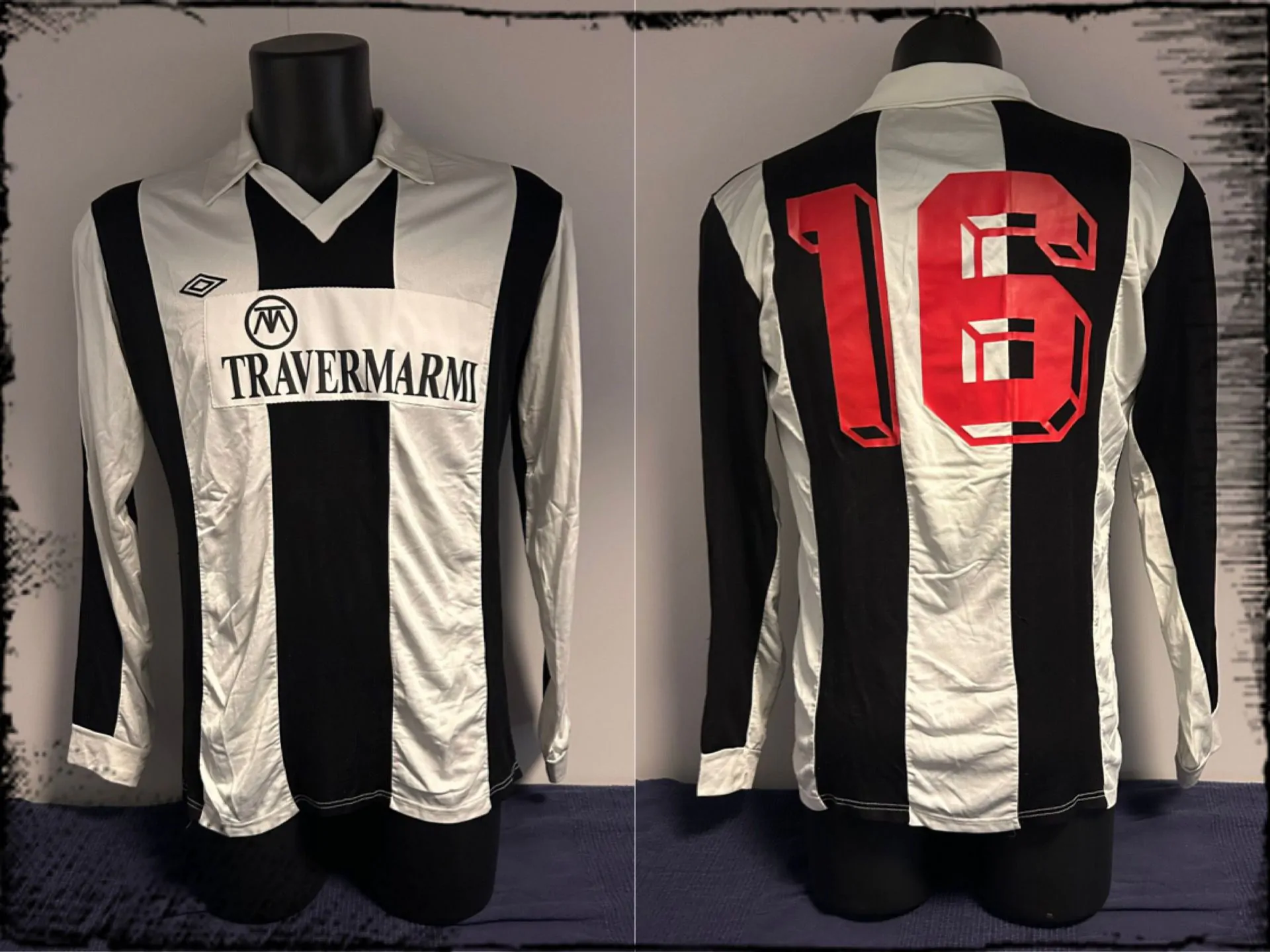 Il tessuto è già in cotone misto acrilico, tipicamente di produzione Umbro anche se questo modello è leggermente felpato all’interno per riscaldare il calciatore durante le partite del periodo invernale. La maglia reca una toppa cucita con lo sponsor commerciale Travermarmi, una ditta di produzione di pietre e marmi, tipica della zona, che risulta ancora attiva con sede a Montignoso in provincia di Massa e Carrara.