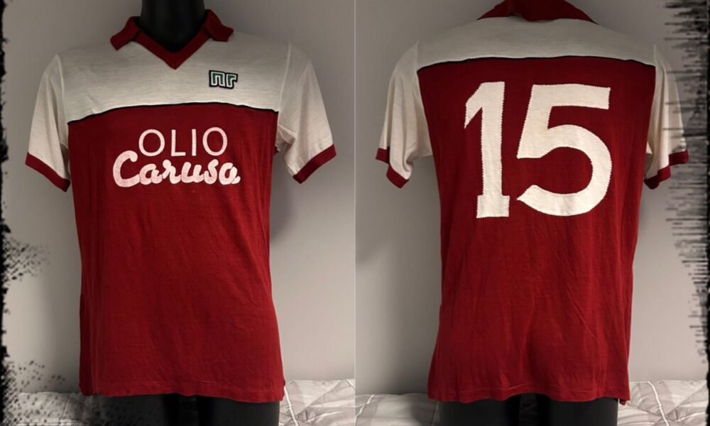 La maglia in collezione è piuttosto rara ed inconsueta, non essendo totalmente granata ma bianca nella parte superiore, all’altezza di colletto e maniche. La maglia è in lanetta leggera ed è stata, anche questa, prodotta dalla Ennerre. Lo sponsor anche per questa stagione è l’azienda agricola “Olio Caruso”, a conduzione familiare e sita nel comune di Caltabellotta (Agrigento), attiva fin dal 1980. Olio Caruso fu sulle maglie del Trapani a partire dalla stagione 1984-85 e fino a quella del 1986-87.