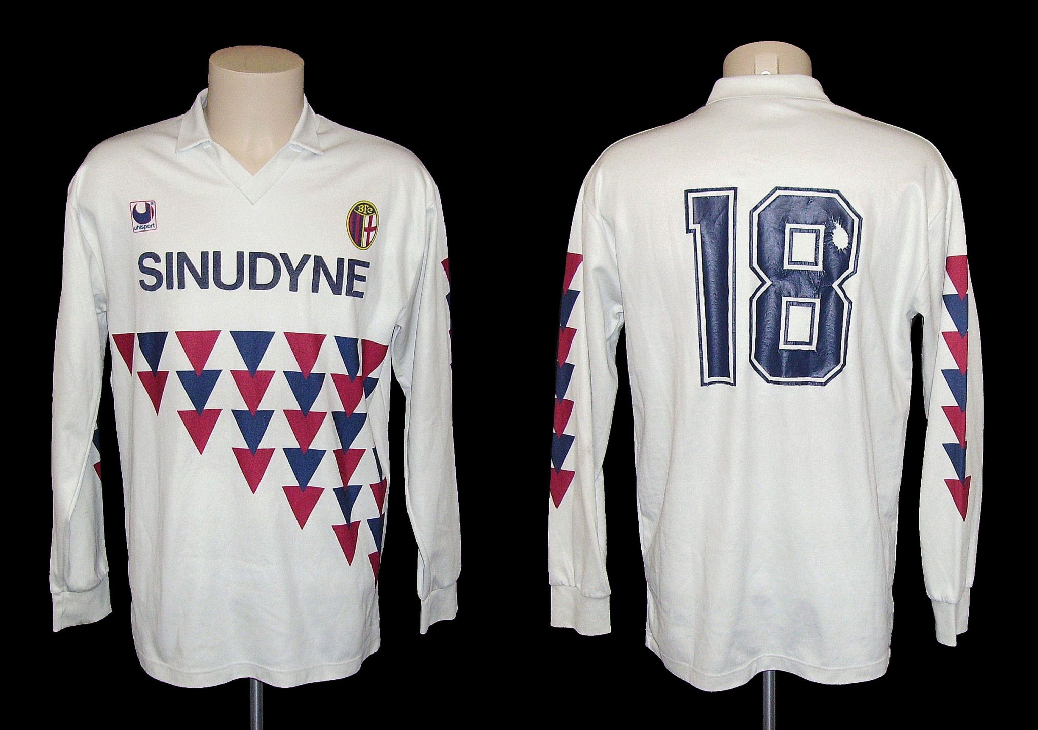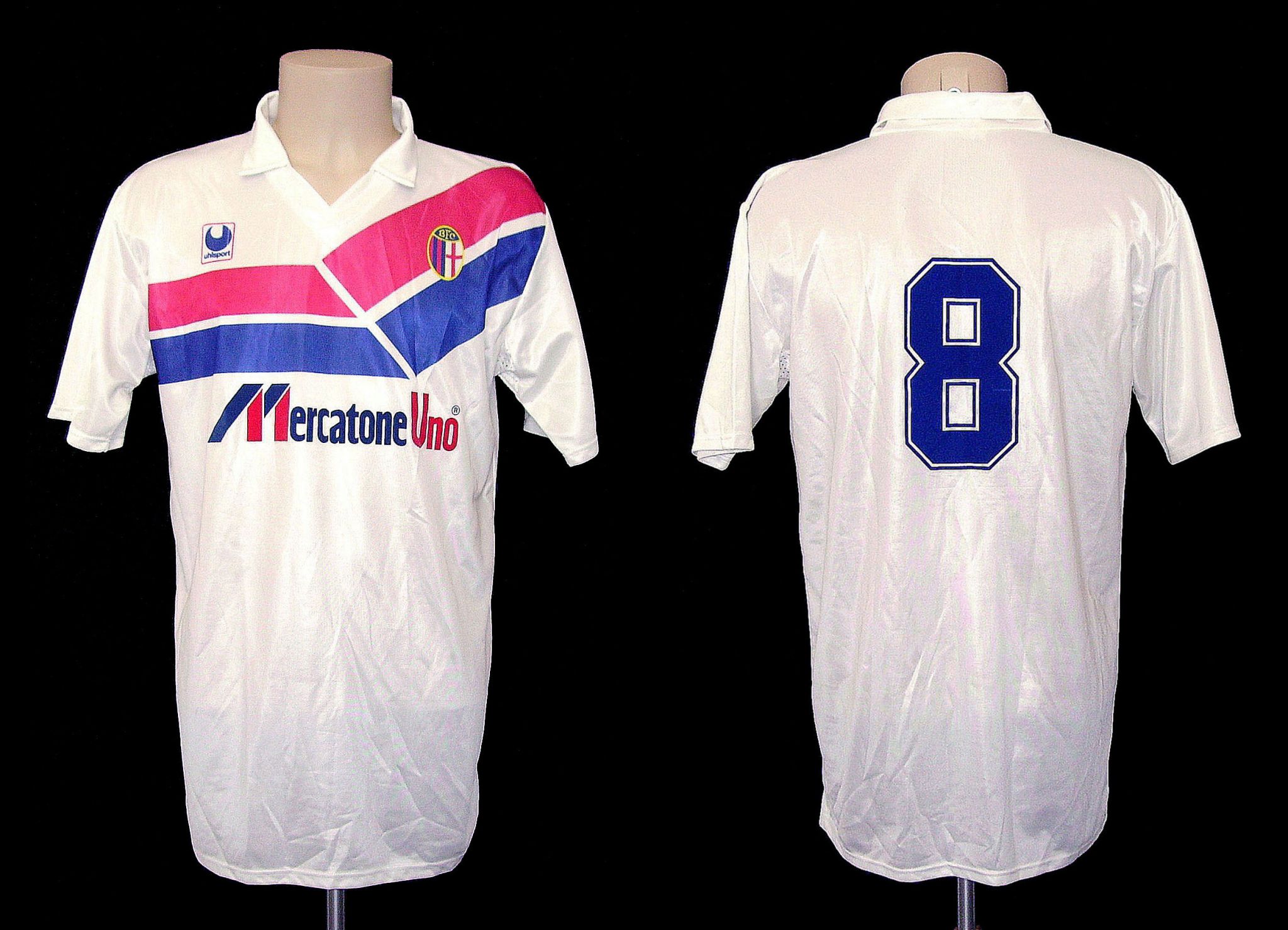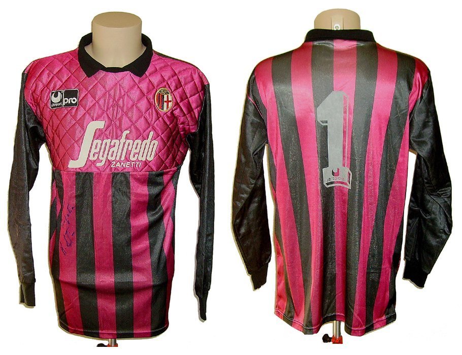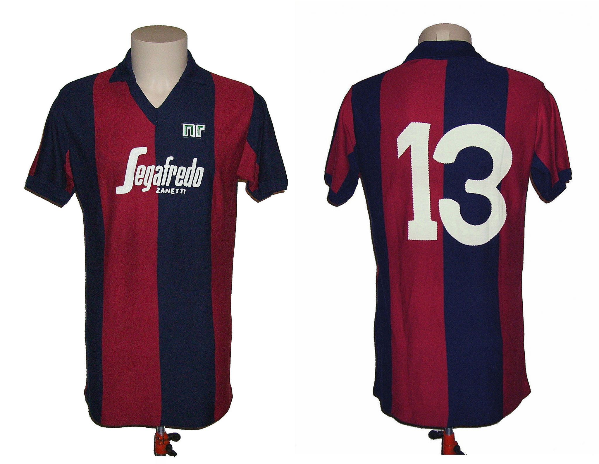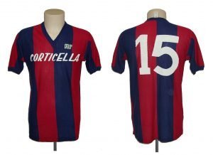 “Un aneddoto…?”, risponde il nostro amico collezionista a domanda precisa, “Vi racconto della Bertagni verde 82-83. Riesco a contattare Giorgio Roselli, attuale allenatore del Monopoli, mentre ero alle prese con il libro che abbiamo pubblicato sulle maglie del Bologna, e gli chiedo se è ancora in possesso di qualche maglia del Bologna; lui mi manda le foto ma mi dice anche che ha tenuto una maglia per ogni stagione che ha giocato, che quella è l’unico ricordo che ha del Bologna, e non è intenzionato a venderla. Lo ringrazio dicendogli che se per caso cambiasse idea, sarei disposto a fare un sacrificio e di conseguenza una grossa offerta per quella maglia. A questo punto mi scrive un messaggio dove mi dice testualmente: mandami il tuo indirizzo e lascia stare i soldi, queste cose si regalano a chi ci tiene così. Anche io ci tengo, ma qualcosa dovrò pur ridare al calcio che per il 43° anno consecutivo mi fa fare il professionista! Di maglie me ne hanno regalate decisamente poche, e questo bel gesto vale davvero la pena ricordarlo. Vorrei anche ricordare un episodio con un altro calciatore, di cui non faccio il nome perché ancora in attività, che per due anni consecutivi non solo mi ha procurato la maglia promessa, ma l’ha addirittura portata sotto casa mia. Non so quanti giocatori professionisti, oltre a mantenere le promesse fatte, siano capaci di gesti del genere…”.