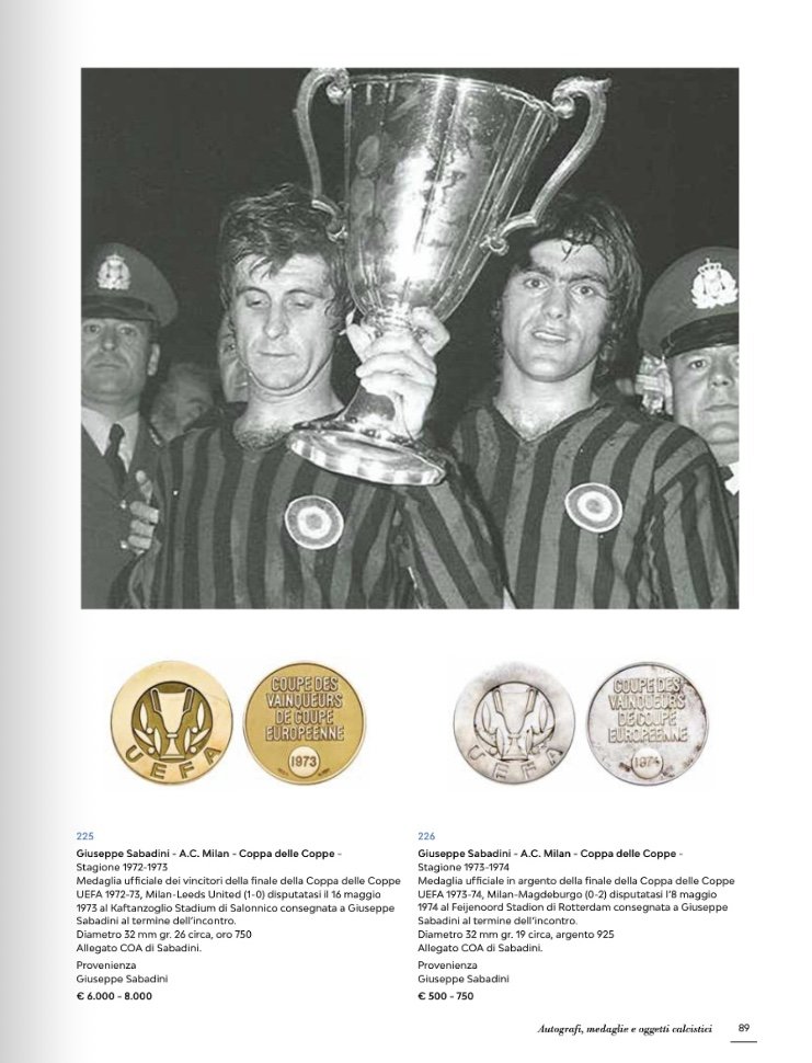 Perché bisognerebbe partecipare a questa asta? “Perché in primis stiamo parlando di oggetti o certificati o di provenienza certa, quindi questo è già di per sé una garanzia”, ci risponde Armandi, “Poi perché si possono trovare delle autentiche particolarità e rarità come la maglia della Nazionale brasiliana indossata da Pelè nel 1971, le 35 medaglie vinte dall’ex calciatore rossonero Giuseppe Sabadini, tra cui la medaglia d’oro per i vincitori della Coppa delle Coppe del 1973. Inoltre sono presenti anche le collezioni di maglie degli ex calciatori Christian Riganò, Vittorio Pusceddu e soprattutto Antonio Valentin Angelillo, tra cui la inedita maglia indossata con la rappresentativa “Milan-Inter” in occasione dell’amichevole contro il Chelsea, disputata a San Siro il 13 ottobre 1965. E se non bastasse ci sono anche la maglia della finale di Coppa dei Campioni ’83-’84, Liverpool-Roma di Gary Gillespie, la maglia della Dinamo Kiev di Oleh Blochin della finale di Coppa delle Coppe stagione ‘74-’75, la maglia della Juventus indossata da Luciano Spinosi in occasione del ritorno della finale di Coppa delle Fiere contro il Leeds Utd disputata a Leeds il 3 giugno 1971 e scambiata a fine partita con l’avversario Mick Jones“.