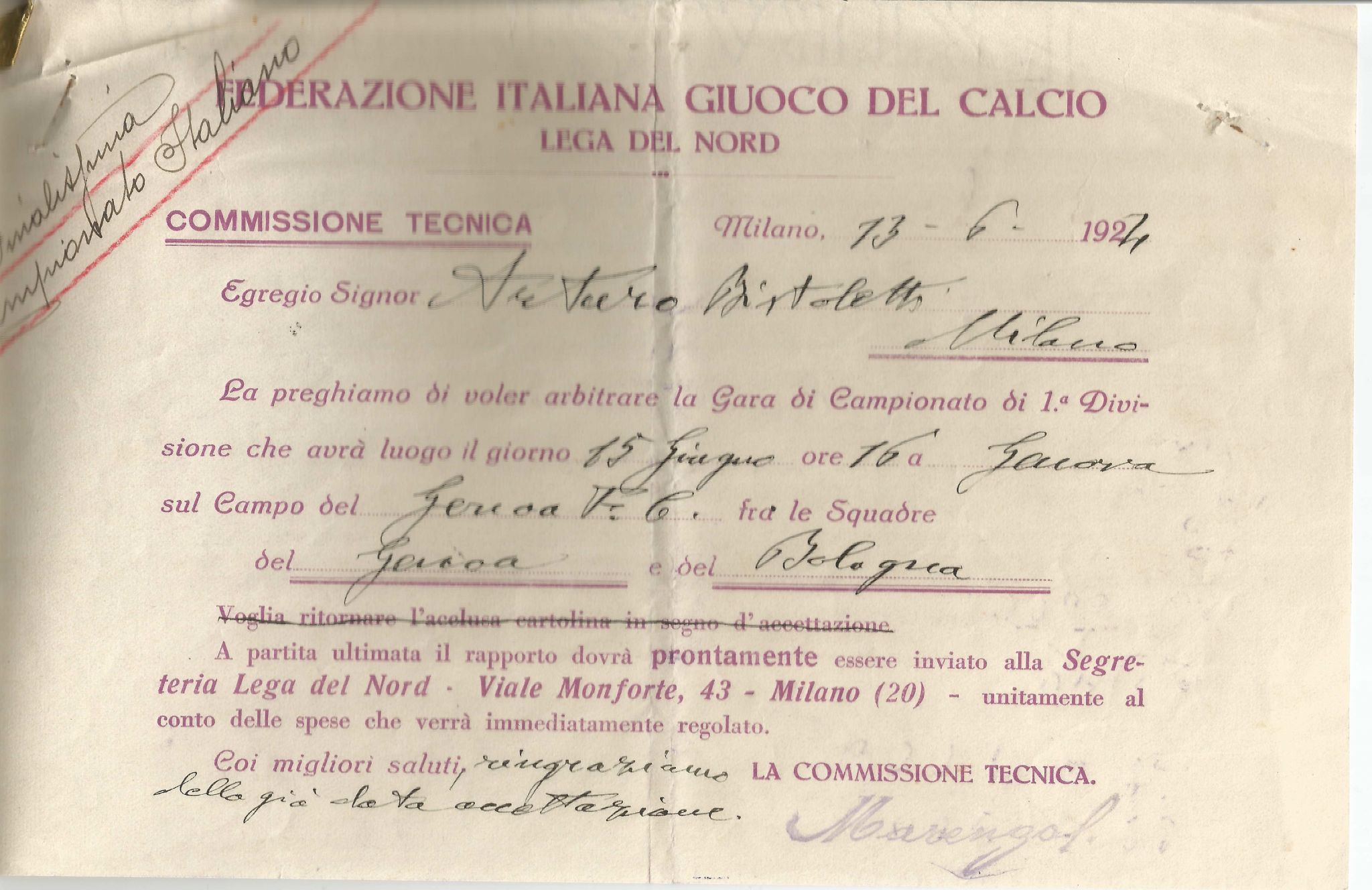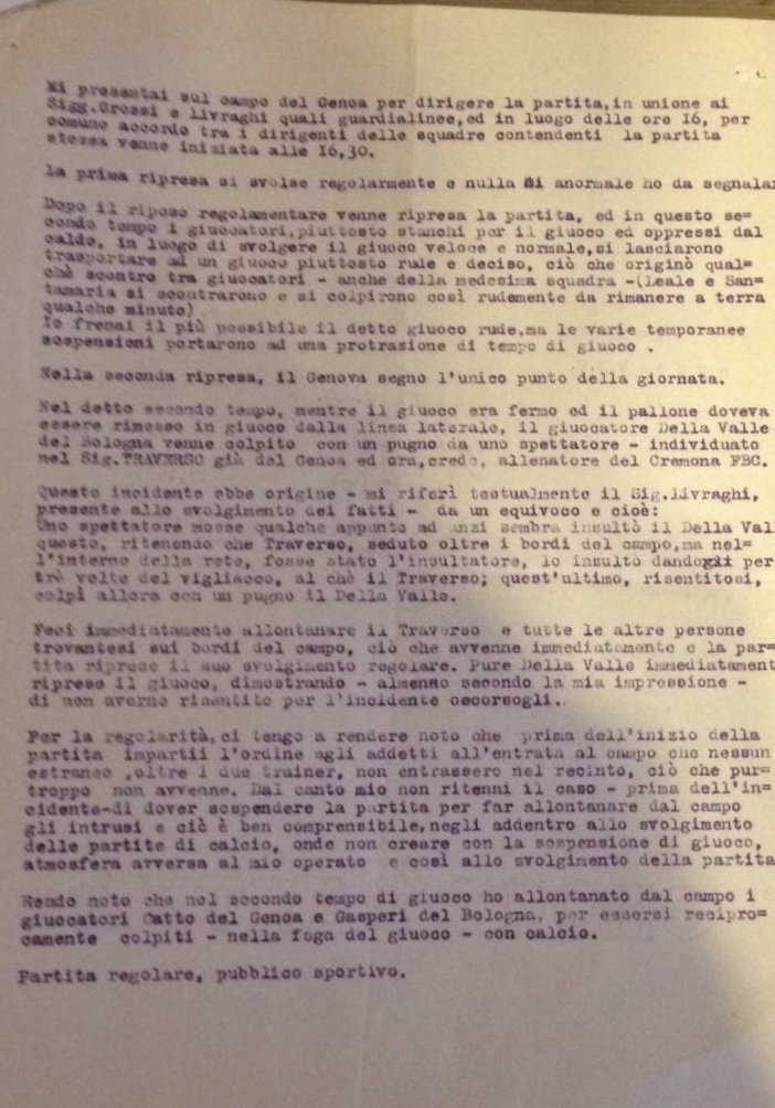 Un arbitro anche molto considerato se è vero, come è vero, che a lui viene data la responsabilità di arbitrare un incontro molto delicato: la partita di andata tra Genova e Bologna valevole per il titolo di “Campione della Lega Nord” del 15 giugno 1924 e che assegna un posto per la Finalissima Scudetto con la vincente della “Lega Sud”. Per la cronaca avrà la meglio il Genoa che riuscirà a conquistare l’accesso alla finalissima ai danni del Bologna e poi a vincere il suo nono scudetto, ma anche l’ultimo sino ad oggi, contro il Savoia. Assolutamente da vedere lo strumento di lavoro dell’epoca: il fischietto. Come assolutamente da leggere, e fare proprio, è quel foglio battuto a macchina da considerarsi come “referto” per la Federazione. Un documento d’altri tempi, poesia allo stato puro.