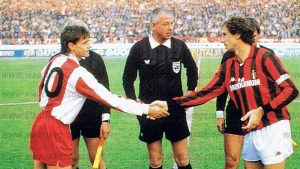Stretta di mano tra Baresi e Stojkovic prima dell’inizio del recupero del 10 novembre. I gagliardetti erano stati consegnati la sera precedente (foto da magliarossonera.it)