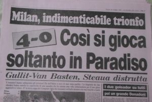 Se dovessi, invece, scegliere le testimonianza che più rende l’idea di quella grandissima squadra citerei, indubbiamente, il titolo riportato nella cronaca della Gazzetta dello Sport dopo la vittoria della Coppa dei Campioni nel 1989. Agli albori della conquiste berlusconiane, la “rosea” scriveva “Così si gioca soltanto in Paradiso” per testimoniare la sontuosità di un calcio giocato in maniera magistrale e che avrebbe segnato un’epoca, come il quotidiano francese L’Equipe, all’indomani della vittoria rossonera, con lungimiranza prevedeva: “Il calcio non potrà più essere lo stesso”.