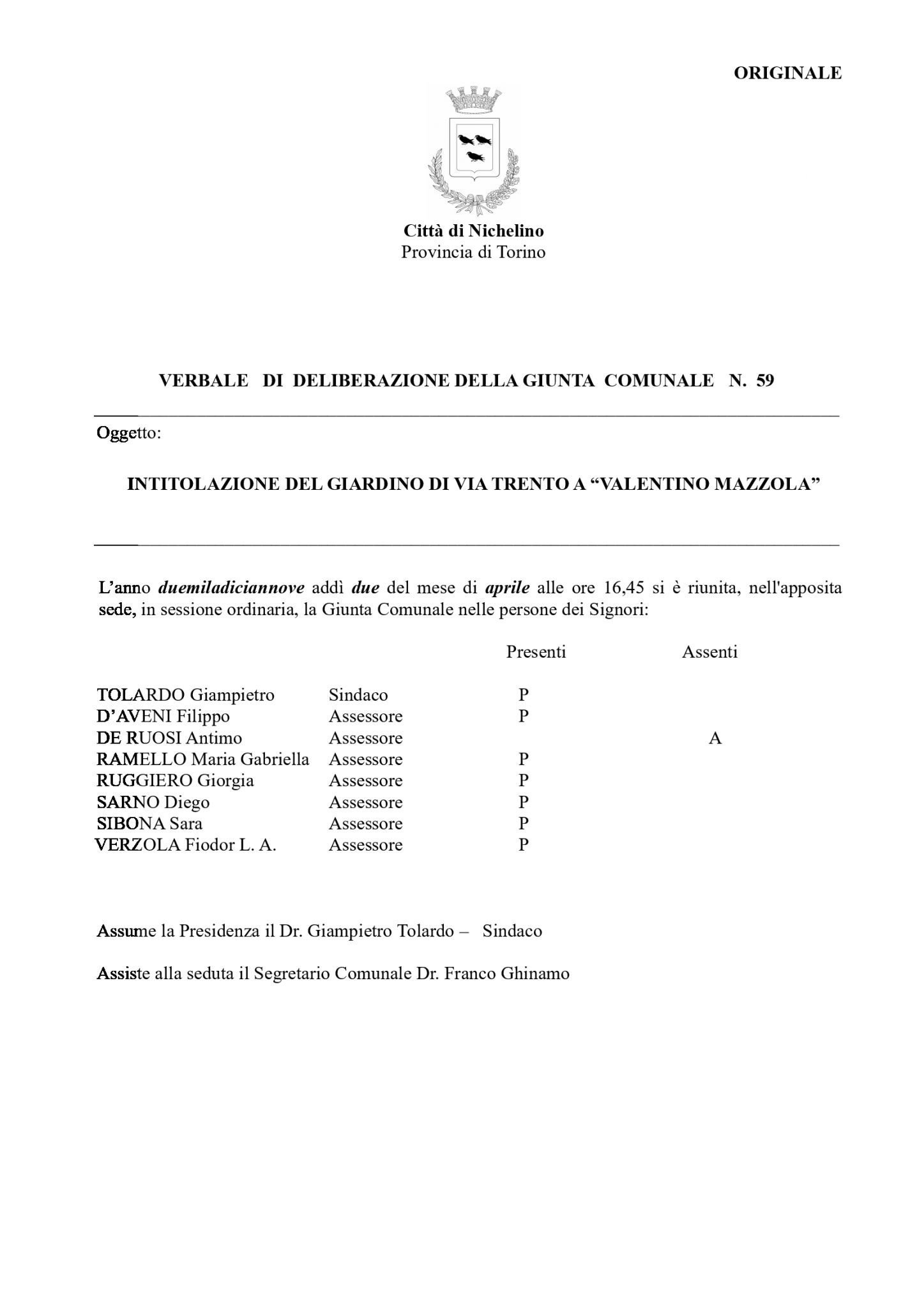 L’altro ieri poi, a Crescentino (Vercelli), è stato inaugurato un monumento dedicato al Grande Torino in presenza degli esordienti 2006 di mister Garella e del Responsabile del Settore Giovanile del club granata Massimo Bava. Poi abbiamo scoperto il Verbale n. 59 di deliberazione della giunta comunale della Città di Nichelino dal seguente titolo: “INTITOLAZIONE DEL GIARDINO DI VIA TRENTO A “VALENTINO MAZZOLA”.