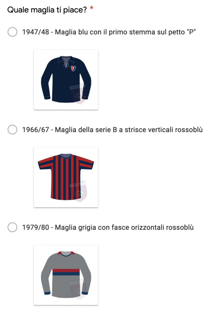 “L’idea nasce dal fatto che volevamo realizzare un qualcosa di veramente unico ed emozionante per i tanti nostalgici del passato. Dopo la mostra realizzata nel 2017 con oltre 150 maglie originali (vedi qui il nostro articolo) si è pensato di realizzare questo sondaggio portando l’attenzione su tremaglie storiche, anni ’40, di colore blu con il primo stemma sul petto, una “P”, anni ’60, classica maglia strisce verticali rossoblù, e infine anni ’70, tutta grigia con fascia orizzontale rossoblù sul petto”