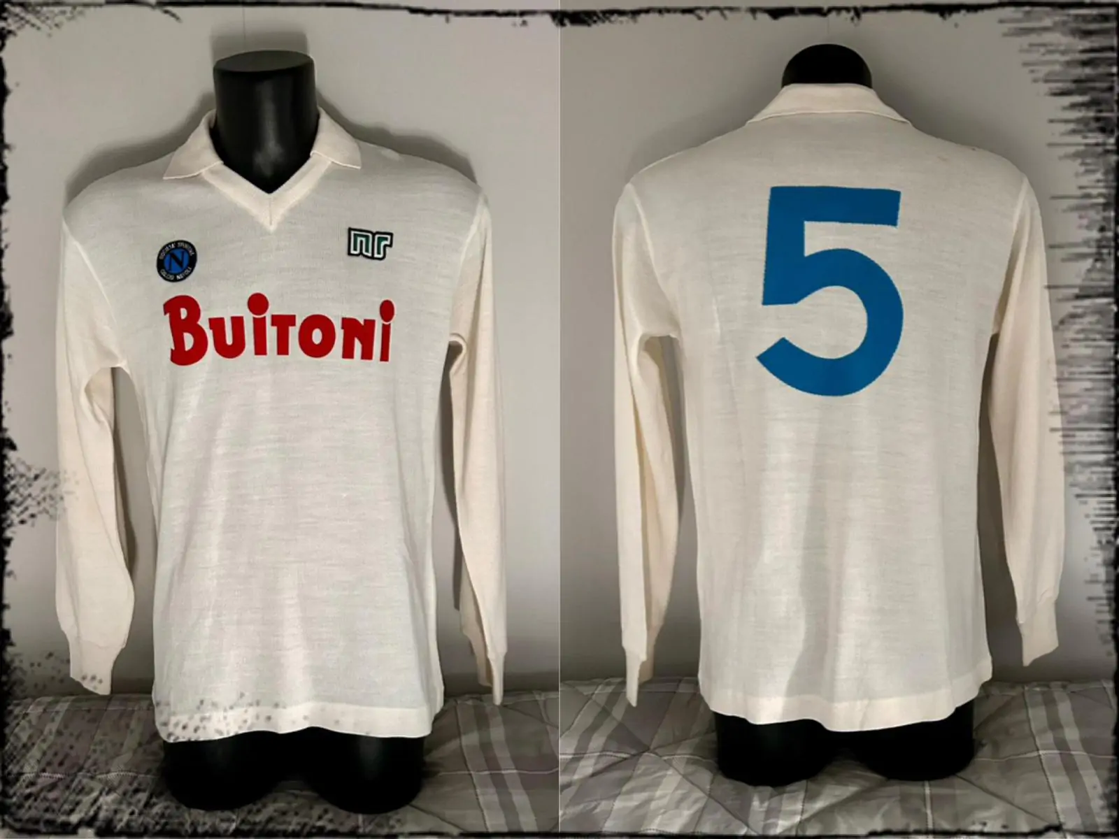 Si tratta di un modello invernale in lana pesante che reca il celebre sponsor Buitoni in rosso, lo stemma societario di colore blu scuro che, a differenza della maglia presentata due settimane fa, è cucito alla maglia e non stampato in vernicetta; il numero 5 sul retro maglia, nell’inconfondibile color azzurro Napoli, è di forma più “panciuta” e se ne trova riscontro anche nella foto di Ferrario in campo a Bergamo, ritratto di spalle durante la partita.