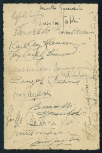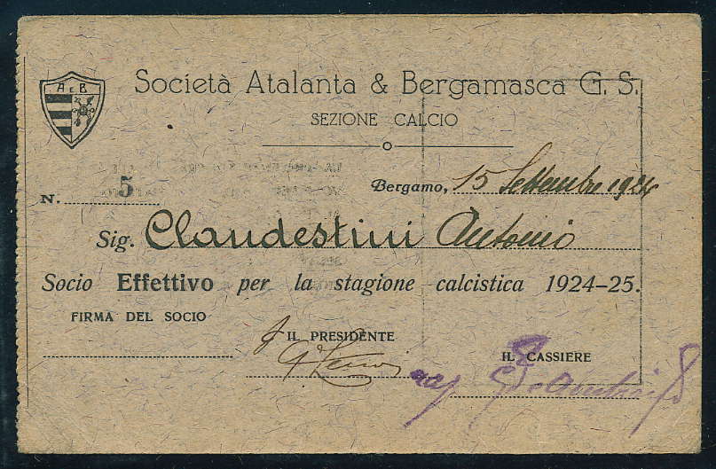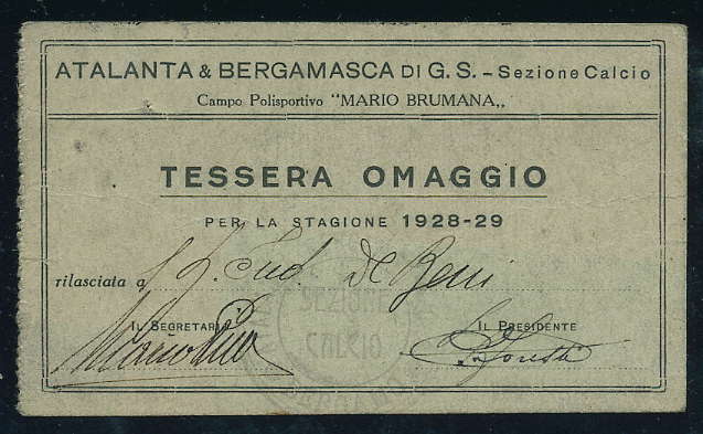 “I pezzi che considero migliori sono sicuramente la prima cartolina conosciuta dell’Atalanta, 1913, con i colori sociali bianconeri… quella che appare su wikipedia per intenderci”, la sua voce diventa sempre più orgogliosa, “poi la cartolina della squadra schierata a Brescia nel 1919, prima di disputare lo spareggio per un posto in serie A contro l’altra squadra di Bergamo, la Bergamasca appunto, che poi verrà inglobata nel nome completo attuale: Atalanta e Bergamasca Calcio; l’abbonamento “omaggio” rilasciato al costruttore dello stadio Brumana nel 1928, Ing DE BENI; la cartolina del 59/60 costruita in studio con la foto del campione europeo di pugilato dei pesi leggeri, Livio Minelli, bergamasco e atalantino, contornata dalle foto piccole della rosa atalantina di quell’anno, ovviamente autografata da tutti… Inutile dire che sono legato a tutti i pezzi in maniera morbosa e non saprei sceglierne uno in particolare. Paradossalmente i pezzi più costosi non sono nemmeno i più rari o importanti: tra questi, ci sono 3 foto-cartoline del 1928, scattate durante l’inaugurazione dello stadio “Brumana” di Bergamo e prese in blocco per poter avere la squadra dell’Atalanta schierata in campo nella circostanza”. Roba da urlare veramente questa volta…