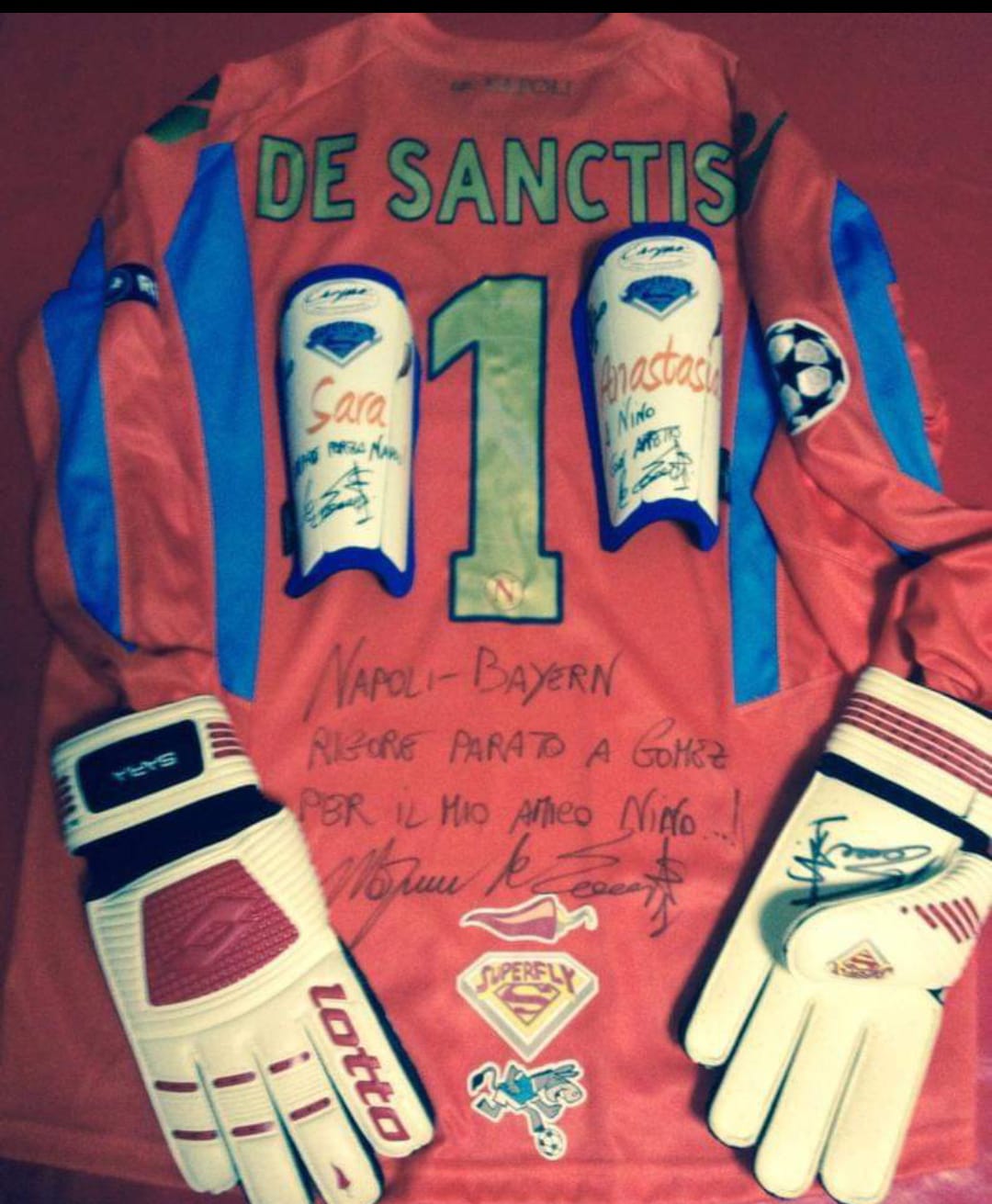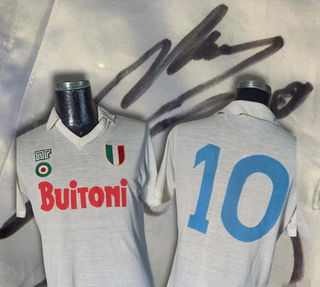 Gli aneddoti nella carriera da primato di Nino sono tantissimi e riguardano le peripezie per avere una maglia, le trattative per cederne qualcuna, le amicizie con i calciatori e gli incontri con il grande Pibe de Oro … “Ti racconto quelli più importanti, anche perché ce ne sarebbero tantissimi. Tu pensa che, nonostante viva a Capri, sono riuscito a prendere la maglia di Lozano che era finito in ospedale dopo l’infortunio, tramite amici che mi hanno fatto delle cortesie. La maglia era completamente strappata ma, proprio per quello, era una chicca che cercavano in tanti. Chi me l’ha data mi ha detto che quella maglia doveva andare nella mia collezione, perché me lo meritavo. Io sono fortunato perché ho potuto conoscere tanti calciatori grazie al lavoro che faccio, al mio carattere estroverso, al posto in cui vivo. Da Capri passano tutti. Io ho una maglia di Maradona dell’Argentina, certificata e rara, ancora con l’erba del campo dentro. Un signore la voleva comprare ma scoppia il covid e la vendita slitta. Purtroppo ci lascia Diego e quel signore mi offre il doppio. A quel punto ho riflettuto bene e ho deciso di non venderla più perché per me quella maglietta è un pezzo di cuore: a tutto c’è un prezzo, ma poi subentra il cuore. Parlando di Maradona ti dico solo che l’ho incontrato due volte. La prima volta, come detto, nel Giugno ’89 a Capri: una emozione unica. La seconda volta ci fu uno spettacolo con Siani al Teatro San Carlo. Le mie maglie erano lì. Tu pensa che avevo il pass e non riuscivo andare da Capri a Napoli per il maltempo. Riesco ad arrivare, scendono le nostre magliette, finisce lo spettacolo e io mi porto una maglietta da far autografare. Non ti facevano passare ma riesco ad infilarmi e arrivo davanti a Diego. Quando arrivai lì, salgo sul palco, faccio una foto con lui ma rimango bloccato e con la maglietta in mano”.