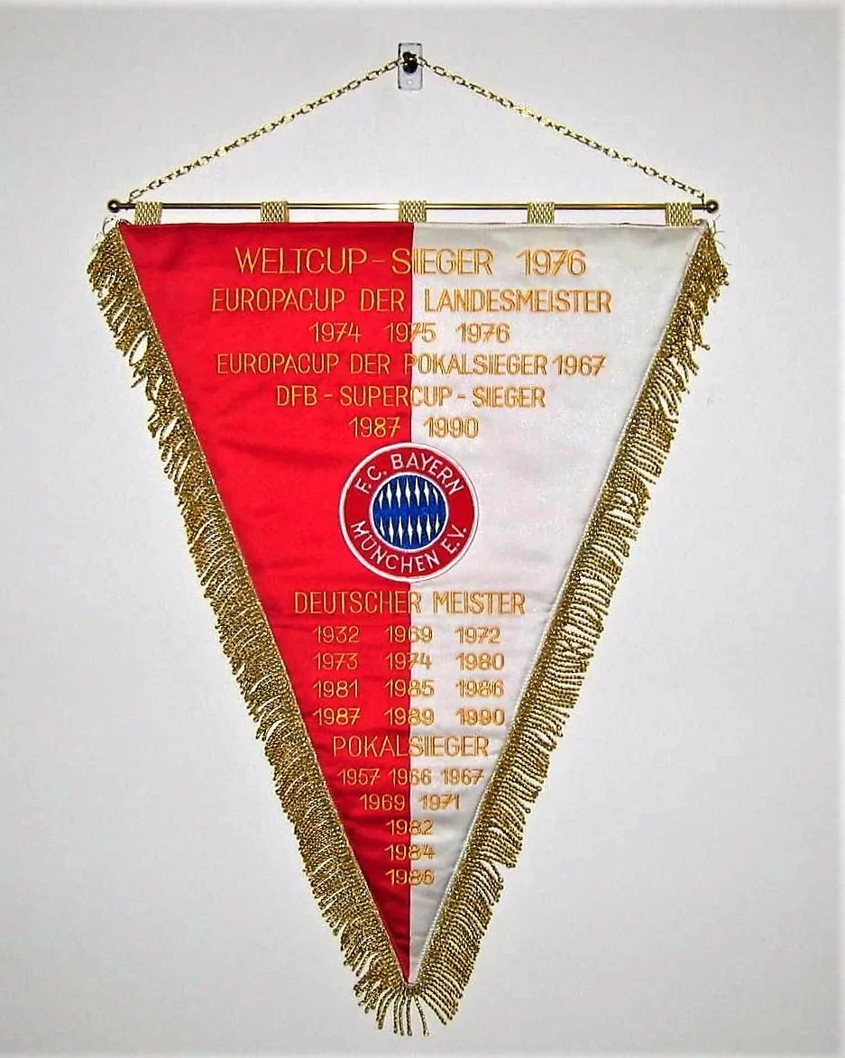 Circa i gagliardetti è sorprendente come nell’arco degli anni abbiano conservato le proprie caratteristiche. Negli anni sessanti, per intenderci il periodo in cui i bavaresi accolgono come simboli i colori della Baviera e quelli societari, sono riparti in bianco e rosso con lo stemma circolare del club apposto centralmente e sormontato dall’iscrizione della competizione.