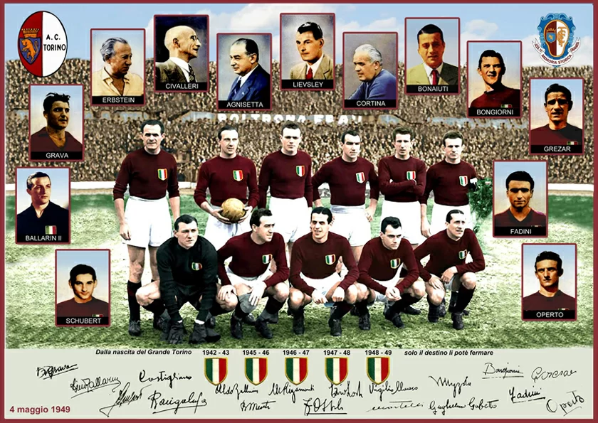 GLIEROIDELCALCIO.COM (Federico Baranello) – Il 4 maggio 1949 la squadra del Torino, del Grande Torino, fa ritorno a casa dopo aver affrontato il Benfica in quel di Lisbona in una partita amichevole per omaggiare Francisco Chico Ferreira. Una partita voluta e organizzata proprio dai due capitani delle squadre, Ferreira appunto e Valentino Mazzola. Il trimotore Fiat 212, a causa di una fitta nebbia che avvolgeva il capoluogo Piemontese e le zone circostanti, si schianta sulla Basilica di Superga. Sono le 17,05…”E la notizia tremenda piombò all’improvviso, tra la gente che percorreva i portici lungo le vie affollate del centro. Giunse come una folgore, si diffuse rapidissima. Qualcuno la ripeteva balbettando – L’apparecchio del Torino è caduto a Superga. Contro la Basilica – Una frase sconnessa, piena di enorme stupore. Non vi era altro. Non si sapeva da quale parte giungesse…” (Cit. La Stampa, 5 maggio 1949).