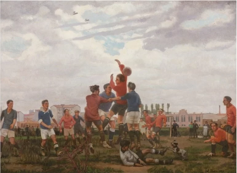GLIEROIDELCALCIO.COM (Danilo Comino) – Nel presente articolo prendiamo in esame Partita di calcio, quadro del 1924 del pittore veneziano – ma milanese d’adozione – Leonardo Dudreville, che fa parte della collezione del Museo del Novecento di Milano. Dudreville fu uno dei sette fondatori di Novecento, il movimento artistico nato nel capoluogo lombardo sul finire del 1922 su ispirazione della scrittrice e critica d’arte Margherita Sarfatti, che all’epoca aveva una relazione molto stretta con Benito Mussolini. Sul piano culturale l’esperienza di Novecento si colloca all’interno di una più generale esigenza di “ritorno all’ordine”, manifestatasi nel campo delle arti figurative dopo la Prima Guerra Mondiale come reazione alle sperimentazioni avanguardistiche (ben esemplificate da Dinamismo di un footballer di Umberto Boccioni). Il denominatore comune dei pittori di Novecento era il ritorno a una pittura d’ispirazione classica dal punto di vista formale – quindi, semplificando al massimo, realistica – ma moderna nei contenuti. Non si trattava, in sostanza, di respingere l’avanguardia in toto, ma di rielaborarla con uno stile più vicino alle comuni abitudini visive. Partita di calcio è un quadro significativo in tal senso perché combina un linguaggio realistico a temi tipici del futurismo come la città, la fabbrica, la macchina (l’aereo) e lo sport: non va dimenticato, del resto, che Dudreville aveva fatto parte, seppur per breve tempo, del movimento futurista. Limitando la nostra attenzione all’aspetto sportivo, notiamo già al primo sguardo che il dipinto di Dudreville presenta un’immagine serena e rassicurante del calcio. È lecito domandarsi quanto, nel 1924, questa immagine corrispondesse al vero.