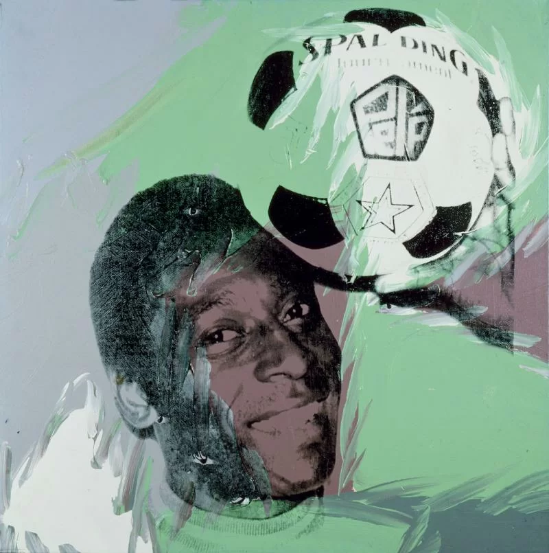 I dieci ritratti di sportivi di Warhol hanno caratteristiche comuni: raffigurano gli atleti in primo piano, a distanza ravvicinata, focalizzando l’attenzione tanto sul loro volto quanto su un oggetto che simboleggia il loro sport (un pallone da calcio, da basket, da football americano, una racchetta, una mazza da golf ecc.). Il ritratto di Pelé rappresenta l’asso brasiliano sorridente mentre regge un pallone della linea a lui dedicata dall’azienda statunitense di articoli sportivi Spalding. In sostanza, il volto di Pelé è associato a un prodotto da lui stesso sponsorizzato. Ci sono più varianti del ritratto: in una dominano toni delicati di azzurro, grigio e verde, mentre in un’altra i colori sono così vivaci e intensi da dare all’opera un carattere quasi aggressivo. Si può notare che, in tutte le versioni, le componenti astratte – forme e colori – giocano con quelle figurative – il volto e il pallone – accompagnandone i contorni o sovrapponendosi a essi. In questo modo Warhol creò una tensione dinamica tra le vivaci superfici colorate e il nero della stampa serigrafica.