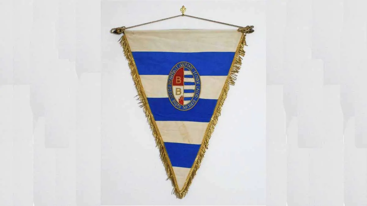 Anche nei gagliardetti in uso negli anni sessanta è presente tale colorazione con lo stemma societario su ancile che riporta sul lato sinistro le due B e i motivi tratti dallo stemma della città e sulla destra le tradizionali fasce bianche e blu. Negli anni ottanta sui gagliardetti si aggiunge il disegno della testa di una tigre a richiamare il soprannome accostato ai calciatori, mentre negli anni successivi mantengono lineamenti tra loro similari.