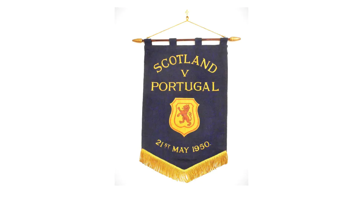 Nel successivo mese di maggio la Scozia incontrò il Portogallo in un’amichevole che venne disputata a Lisbona e che terminò con un pareggio di 2-2. Ricordiamo oggi il gagliardetto che il capitano scozzese scambiò con l’omologo portoghese. Un esemplare realizzato in panno ma davvero di elevata fattura che, oltre alle scritte in stampa dei dettagli riguardanti l’incontro, presenta al centro l’iconico leone rampante rosso simbolo storico delle dinastie reali scozzesi. Lo stesso stemma sfoggiato sulle casacche blu della nazionale scozzese.