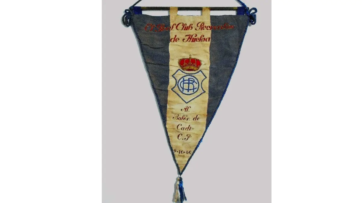 Il gagliardetto ricorda l’incontro valevole per la gara di terza divisione spagnola 1960 – 1961 tra il Recreativo Huelva ed il Balon de Cadiz. È un bell’esemplare caratterizzato dai fini ricami e dalla grande cura dei dettagli. Questi erano elementi caratteristici dei gagliardetti spagnoli di quel periodo con il tradizionale punto di ricamo particolarmente prezioso nel tratto e nel dettaglio della corona che sovrasta lo stemma.