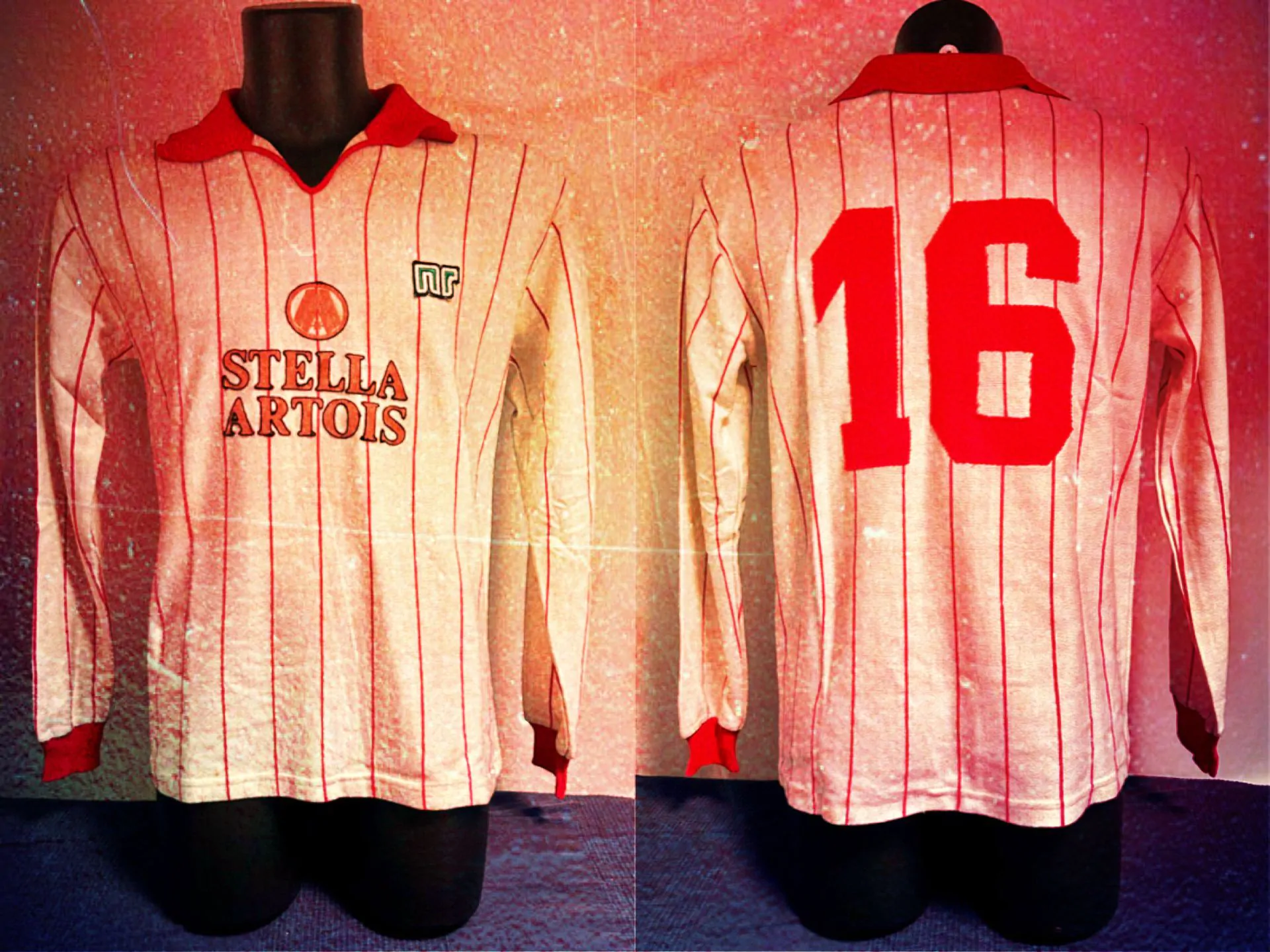 Al centro troviamo, applicato in vellutino rosso, il primo storico sponsor delle maglie biancorosse, il famosissimo marchio del birrificio belga “Stella Artois”, celebre birra tipo Pilsener, originaria di Lovanio e di origine antichissima, addirittura risalente al 1366, all’epoca dello storico birrificio “Den Hoorn”, appunto il corno, che è raffigurato sull’attuale marchio della birra. Il marchio di birra era distribuito all’epoca dai concessionari di zona Mascarin & Boschetti.