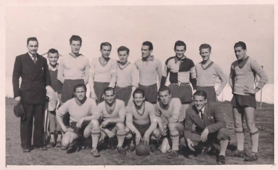 Una vecchia fotografia del Rimini 1945/46: MORRI (presidente), PANDOLFINI ( factotum), FOSCHINI, BALLARDINI, MORRI, FABBRI, CAMPANA, VEROLI, CECCHINI. Acc. MASSARI, GUACCI, CELLI, COMOTTI, BONI (all.) Il portiere Campana indossa una singolare maglia a scacchi blu-celesti, dono degli occupanti britannici.