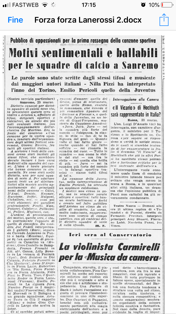 “Diciotto canzoni per diciotto squadre di calcio sono state presentate questa sera al teatro “Ariston”, affollato di tifosi, dirigenti sportivi e calciatori, da alcuni dei più noti cantanti italiani, con l’accompagnamento dell’orchestra De Martino. Era la finale del concorso “Una canzone per la vostra squadra”; lanciato dall’organizzatore degli ultimi festival sanremesi, Gianni Ravera, fra tutti gli sportivi italiani”. Così recita “La Stampa” del 24 marzo 1964, a pochi giorni dalla conclusione del più noto Festival della Canzone Italiana.