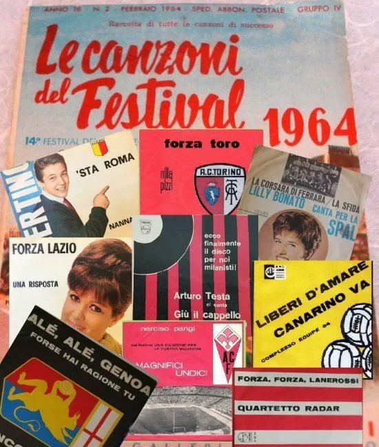 “Diciotto canzoni per diciotto squadre di calcio sono state presentate questa sera al teatro “Ariston”, affollato di tifosi, dirigenti sportivi e calciatori, da alcuni dei più noti cantanti italiani, con l’accompagnamento dell’orchestra De Martino. Era la finale del concorso “Una canzone per la vostra squadra”; lanciato dall’organizzatore degli ultimi festival sanremesi, Gianni Ravera, fra tutti gli sportivi italiani”. Così recita “La Stampa” del 24 marzo 1964, a pochi giorni dalla conclusione del più noto Festival della Canzone Italiana.