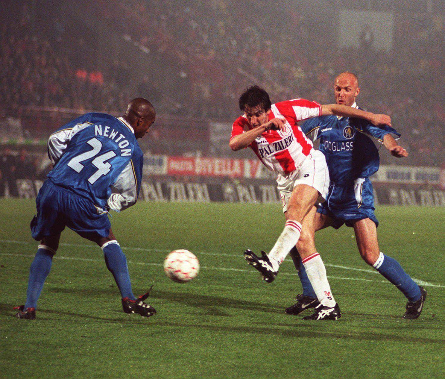 […] I biancorossi, fino a lì, avevano fatto fuori Legia Varsavia, Shakhtar Donetsk e Roda JC. Tutta un’altra storia, certo. Eppure, il 2 aprile 1998, l’incantesimo si consuma parzialmente. Il Romeo Menti pare uno di quei gironi infernali in cui non vorresti inciampare nemmeno per sbaglio. […] Le lane rosse […] dominano al punto che l’1-0 sigillato da Zauli appare alla fine striminzito, stridente rispetto alla mole di occasioni costruite. Il 16 aprile si vola nella City. A Stamford Bridge ci sono 33.800 spettatori pronti a sospingere i blues. Un urlo costate che viene ricacciato in gola quando Pasquale Luiso sfonda la porta per il vantaggio vicentino: il dito si alza davanti alla bocca a zittire lo stadio.