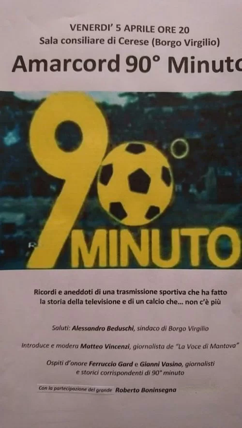 “Un calcio differente, lontano dalla contaminazione economica del nuovo millennio ed in cui la differenza la facevano i ruoli, i numeri di maglia accostati a questi ultimi, gli aneddoti che solo chi andava allo stadio poteva trasmettere e il tifo incoraggiante nel vedere i propri beniamini giocare a pallone”. Una frase quest’ultima molto bella, molto vera, pronunciata da Matteo Vincenzi, giornalista de La Voce di Mantova e organizzatore della serata “amarcord” dedicata a 90° Minuto e ai suoi indiscussi protagonisti, gli inviati dai campi di calcio, che si svolgerà nella sala consiliare municipale di Borgo Virgilio il prossimo 5 aprile.