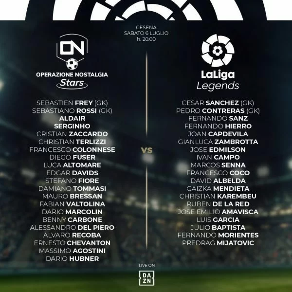 Avremo tutti, quindi, la possibilità di poter (ri)vedere calciatori e leggende del calcio e per qualche ora avremo l’illusione che il tempo non sia mai passato. Saranno sette i campioni del mondo in campo suddivisi tra le due squadre; Operazione Nostalgia Stars potrà infatti schierare ‘Pluto’ Aldair (1994), Alex Del Piero e Cristian Zaccardo (2006), mentre la Liga Legends risponderà con Gianluca Zambrotta (2006) Edmilson (2002), Christian Karembeu (1998) e Joan Capdevila (2010).