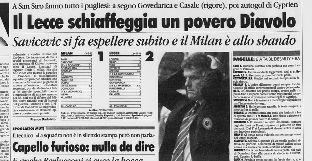 QUOTIDIANO DI PUGLIA (Antonio Imperiale) – […] Era il 19 di ottobre […] Era il 1997. Una domenica scritta nel libro della storia giallorossa: Milan-Lecce 1-2. L’unico successo salentino alla Scala di San Siro, versione rossonera. Stefano Casale entra quasi in cronaca diretta, ventidue anni dopo, “Al 2’ gol di Govedarica, Lecce in vantaggio, 1-0. Il primo tempo si avvia verso la fine e Francesco Palmieri si fa parare il rigore da Taibi. Sarebbe stato il 2-0. Al 49’, De Santis,l’arbitro, ci concede un secondo penalty, per fallo da dietro su Ross. Non fallisco, mi riesce il raddoppio, Milan furioso nella ripresa, ma in dieci per l’espulsione di Savicevic, per un fallo su di me. Lorieri para tutto, i cannonieri del Milan restano a secco. Il terzo gol lo segniamo sempre noi, nella nostra porta, uno sfortunato autogol di Cyprien. Vinciamo per 2-1. Un giorno di gloria. Indimenticabile”.
