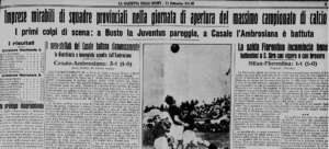 GLIEROIDELCALCIO.COM (Francesco Quattrone) – Nella Stagione 1929\30, la Pro Patria disputa il suo primo campionato di Serie A. Presidente Marcora, in panchina Bekey. All’esordio casalingo batte la Cremonese per 4 a 2. La formazione base era composta da Montrasio, Fizzotti, Monza, Borsani, Bocchi, Pelegatta, Rossi, Colombo, Bonivento, Reguzzoni e Vigna. Si piazza al 12° posto frutto di 6 vittorie, 6 pareggi e 16 sconfitte.