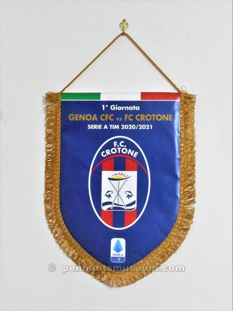 Il gagliardetto presentato oggi è il primo che il Crotone ha utilizzato facendo apporre le indicazioni della partita insieme al proprio stemma e a quello della serie A. Tale gagliardetto è stato utilizzato per l’intera stagione 2020 – 2021 purtroppo terminata con la retrocessione in serie B della formazione calabrese.