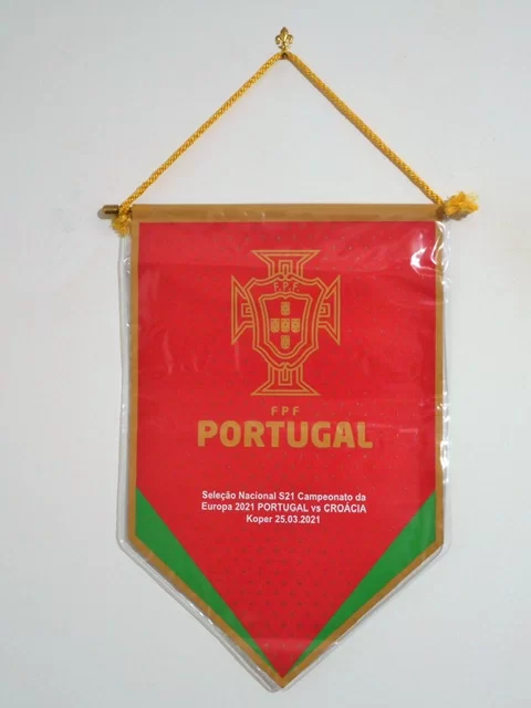 Il gagliardetto con i dettagli dell’incontro, del tutto similare a quello utilizzato dalla nazionale maggiore, riporta anche lo stemma della federazione portoghese che riprende quello apposto sulla bandiera nazionale che sfoggia, al centro, cinque scudi con all’interno altrettanti cerchi bianchi. Per tale ragione la nazionale maggiore portoghese viene appellata come “selecao das quinas” ovvero “la squadra degli scudi”.