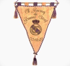 L’eleganza delle insegne impresse sui gagliardetti madridisti rigorosamente in bianco con quello stemma essenziale tagliato trasversalmente dalla fascia viola a rendere onore alla Castiglia come nell’esemplare consegnato agli argentini del Racing de Avellaneda in occasione della partita amichevole disputata il giorno di Natale del 1949 terminata con un perentorio 5 – 1 a favore del Real Madrid.