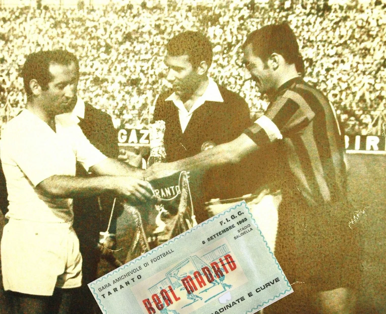 GLIEROIDELCALCIO.COM (Federico Baranello) – Ci sono momenti in cui uno spazio, un luogo, una città sono il centro del mondo. Quei momenti diventano poi patrimonio di un “popolo” che, generazione dopo generazione, lo rivive nei racconti, nelle foto, nei quotidiani… nelle parole di chi era presente… di chi può tramandare l’emozione per averla provata. Uno di questi momenti è, per la città di Taranto, l’8 settembre 1968. Una data ben scolpita nelle menti di chi ha a cuore le sorti della Taranto calcistica, ma non solo. Al “Salinella”, ora “Erasmo Iacovone”, va in scena un’amichevole di lusso, dal forte sapore europeo, dal profumo di “Coppa dei Campioni”: il Real Madrid giunge nella “Città dei due mari”. Non solo tarantini allo stadio, ma anche tanti altri appassionati tifosi del Sud Italia che cercano di accaparrarsi un tagliando valido per poter essere al “centro del mondo”, almeno una volta, almeno per una serata. La cornice di pubblico è ovviamente importante, divertita e calorosa; ha voglia di calcio, ha voglia di un calcio che conta. Non è importante il risultato in questa serata, piuttosto è importante essere vicino alla squadra e godersi gli “ospiti”, imbottiti di campioni del calibro di Amancio, Gento e Sanchís tanto per citare i più attesi.
