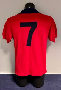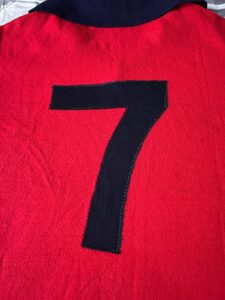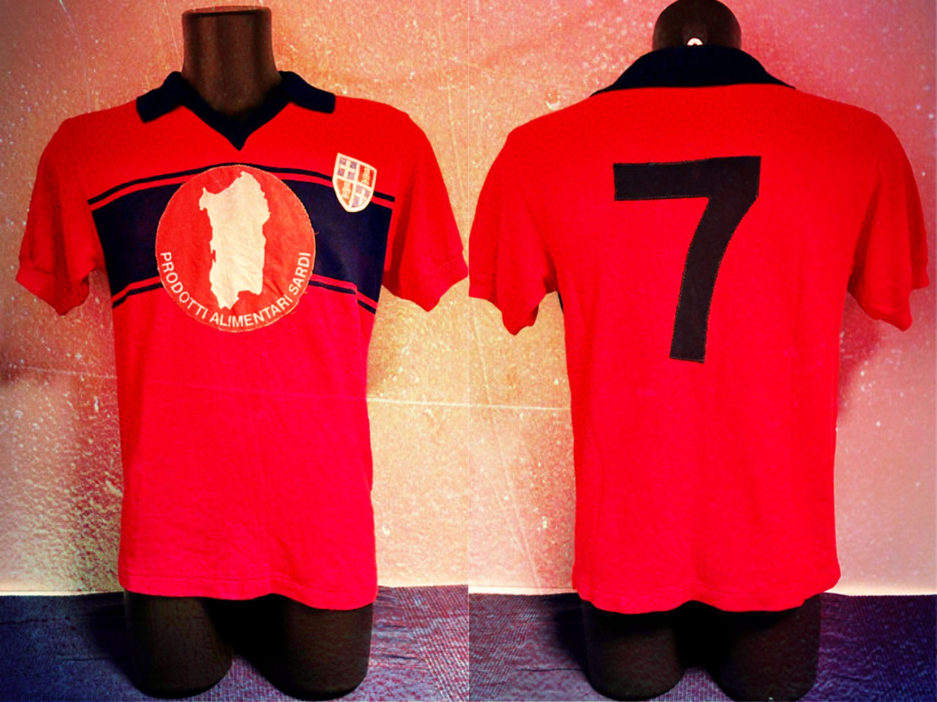 A differenza della precedente maglia da trasferta pubblicata un paio di anni fa, questa è una bellissima maglia in lanetta a manica corta ed è la prima divisa, o meglio, una delle varie versioni di prima maglia usata dai torresini in quella stagione. La vediamo indosso a quello che fu uno dei calciatori simbolo di quella squadra, il giovane ma già talentuoso Gianfranco Zola da Oliena. La maglia è straordinaria: rossa con una larga banda e due sottili strisce blu orizzontali. Anche il colletto è blu scuro esattamente come la banda centrale e dello stesso colore è il numero, bellissimo in panno, cucito sul retro della maglia.