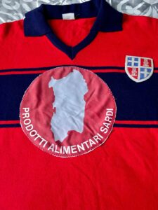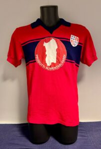 Al centro della banda blu troviamo lo sponsor della maglia, rappresentato da una toppa cucita che raffigura la piantina della Sardegna e la scritta “Prodotti Alimentari Sardi”. Questo sponsor sarà sulle maglie dei rossoblù sassaresi per l’intera seconda parte degli anni Ottanta, vale a dire dal 1985 al 1990. Nella parte di sinistra, poco più sopra dello sponsor, troviamo, in una toppa cucita, il bellissimo stemma del club, adottato a partire dagli anni Cinquanta (e da allora modificato unicamente dal punto di vista grafico, ma mai nella sostanza).