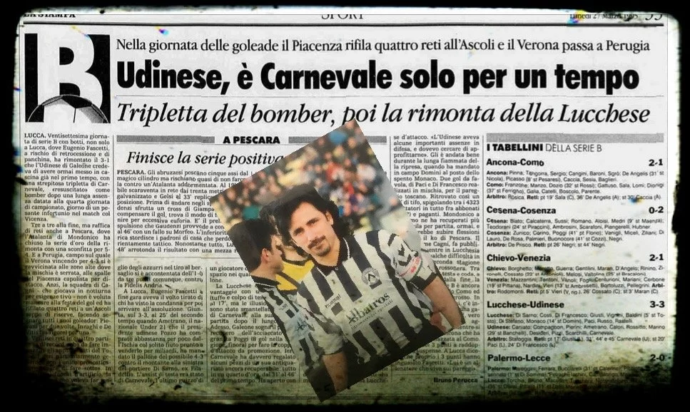“Il 26 marzo 1995, ventisettesima giornata del torneo di Serie B – l’Udinese di Giovanni Galeone che era subentrato a novembre ad Adriano Fedele, è di scena sul campo della Lucchese. La formazione bianconera si trova in seconda posizione dietro il Piacenza. All’Udinese andrebbe bene anche un pareggio e, alla fine, dal terreno di gioco toscano esce il segno X: il match si conclude 3-3. Il mattatore è Andrea Carnevale che realizza una tripletta, la prima e unica della sua carriera. Carnevale è reduce da un lungo stop dato che a settembre, nel match casalingo con il Vicenza, 0-0, aveva subito la lacerazione del crociato. Contro la Lucchese segna tre reti in rapida  successione dopo quella iniziale dei toscani (al 17’), al  31′, 44′ e 45′. Nella ripresa però l’Udinese commette qualche errore di troppo, soprattutto con il portiere Caniato e i toscani ne approfittano dapprima per accorciare le distanze al 20’, e poco dopo al 24’ per ottenere l’insperato 3-3.