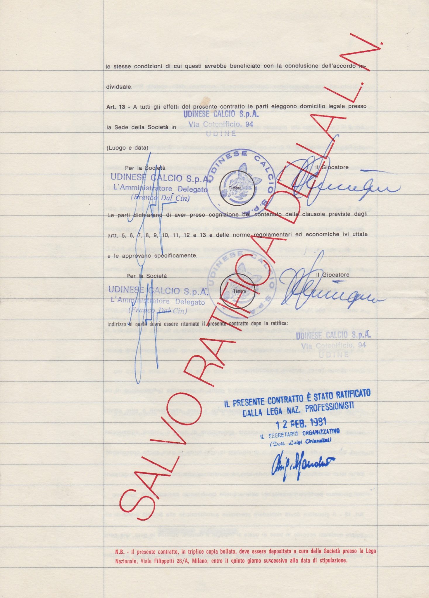 “Tra le maglie che valgono di più, c’è sicuramente quella di Zico utilizzata a Torino contro la Juventus nell’83/84, quella blu, bellissima. Ho ricevuto tante richieste e offerte per quella maglia, ma per me conta il valore affettivo non quello economico. Altro pezzo cui sono molto legato è il contratto di un giocatore che qualcuno ha anche definito “bidone” e/o “meteora, ha avuto invece una media partita ottima: Herbert Neumann. Sono riuscito a recuperare il suo contratto relativo alla stagione 1980/81, con l’importo ben visibile, 100 milioni del vecchio conio, e le firme oltre che del giocatore anche dell’Amministratore Delegato dell’Udinese che all’epoca era Franco Dal Cin. Un “pezzo” a cui sono legato molto più che a una maglia, davvero importante per me”. Qui Antonello fa una pausa, evidentemente si gode ancora questa reliquia dopo averne parlato. A domanda precisa poi risponde: “Il mio sogno? Una maglia anni 40 … questo è il mio desiderio da collezionista dell’Udinese. Colgo anche l’occasione per ringraziare mia moglie Lucia, davvero una pazienza infinita. E’ lei che durante le mostre mi aiuta, mi supporta e mi sopporta. Certo, quando vede che ancora arriva della corrispondenza con delle “cose” si domanda “Ma dove le mettiamo? … prima o poi dovremmo uscire noi da casa”.