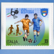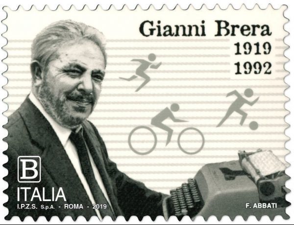 Completano il francobollo la leggenda “GIANNI BRERA”, le date “1919 1960”, la scritta “ITALIA” e l’indicazione tariffaria “B”.