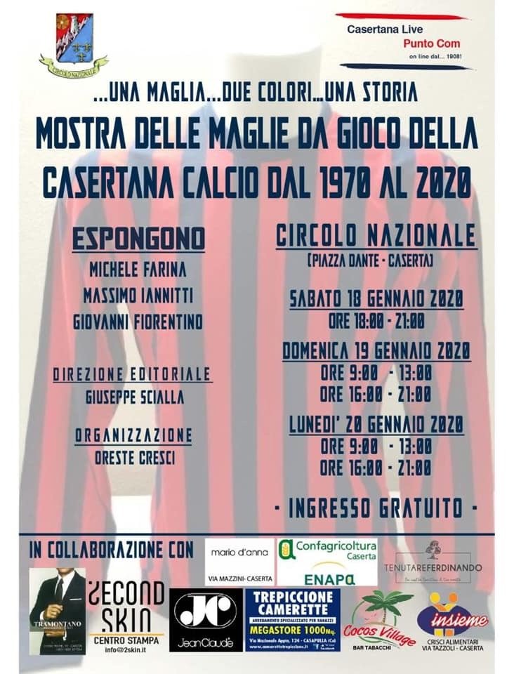 “Ricordo a tutti”, conclude Massimo, “che Una maglia… due colori… una storia è a ingresso gratuito ed avrà inizio sabato 18 gennaio alle ore 18,00. All’inaugurazione sarà presente il Sindaco di Caserta Carlo Marino e l’esposizione continuerà domenica 19 gennaio e terminerà lunedì 20 gennaio… giorno di festa a Caserta, è San Sebastiano”.