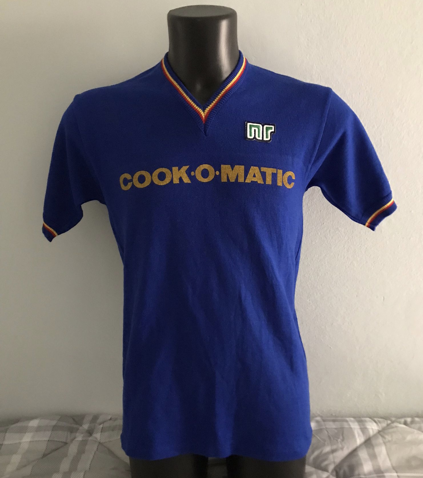 Si tratta della classica Ennerre senza colletto dei primi anni ‘80, con sponsor una famosa marca di pentole, la Cook o Matic, in vernicetta, sponsor utilizzato solo per quella prima storica stagione in cui comparvero per la prima volta gli sponsor commerciali.