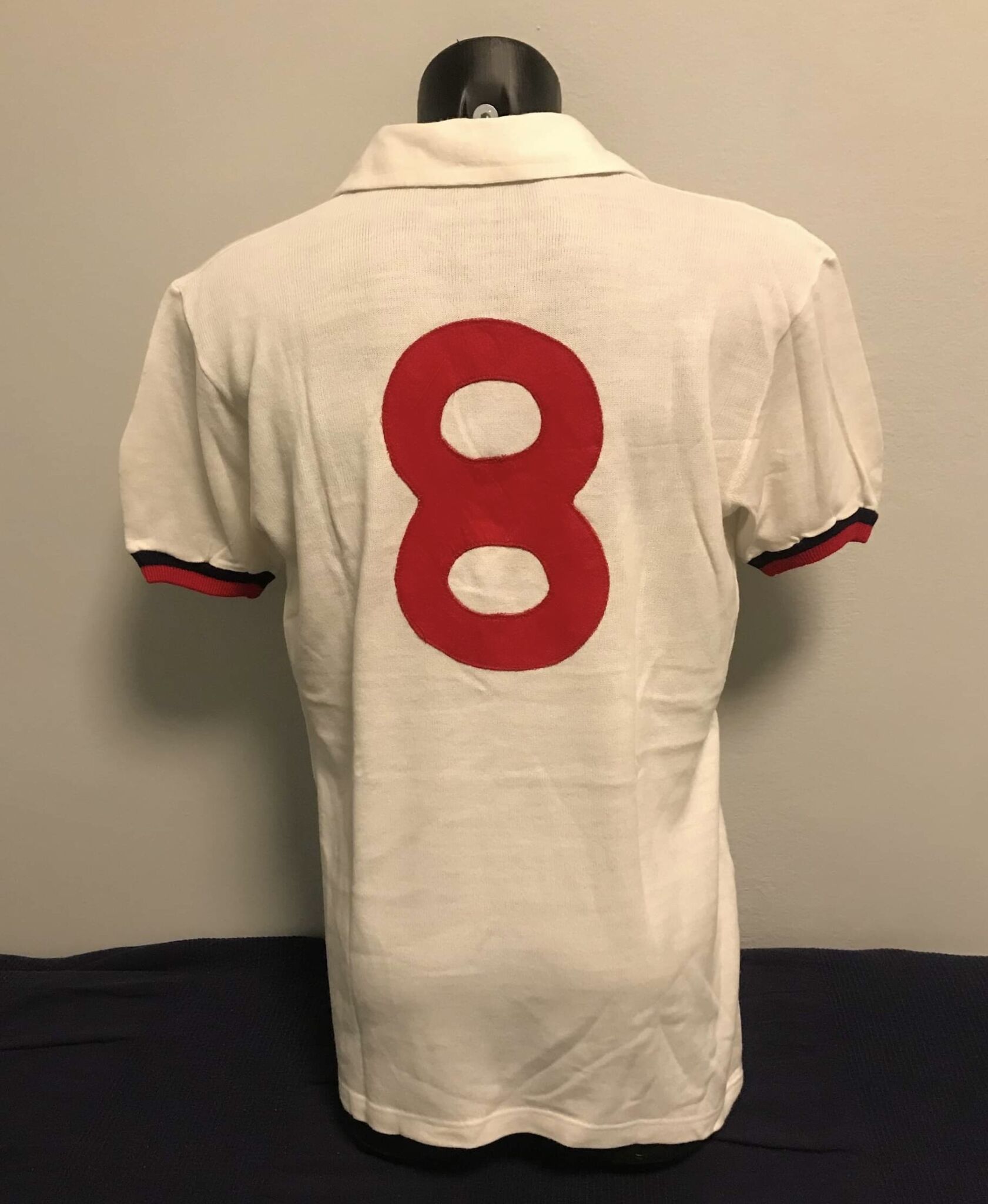 La maglia è molto bella è semplice, in lanetta, con colletto con base rossoblù e bordo manica anch’esso rossoblù. Si può notare una scucitura alla base del colletto, tipico segno di utilizzo della maglia dato che spesso il giocatore che la utilizzava lo tagliava, forse per una maggiore comodità.