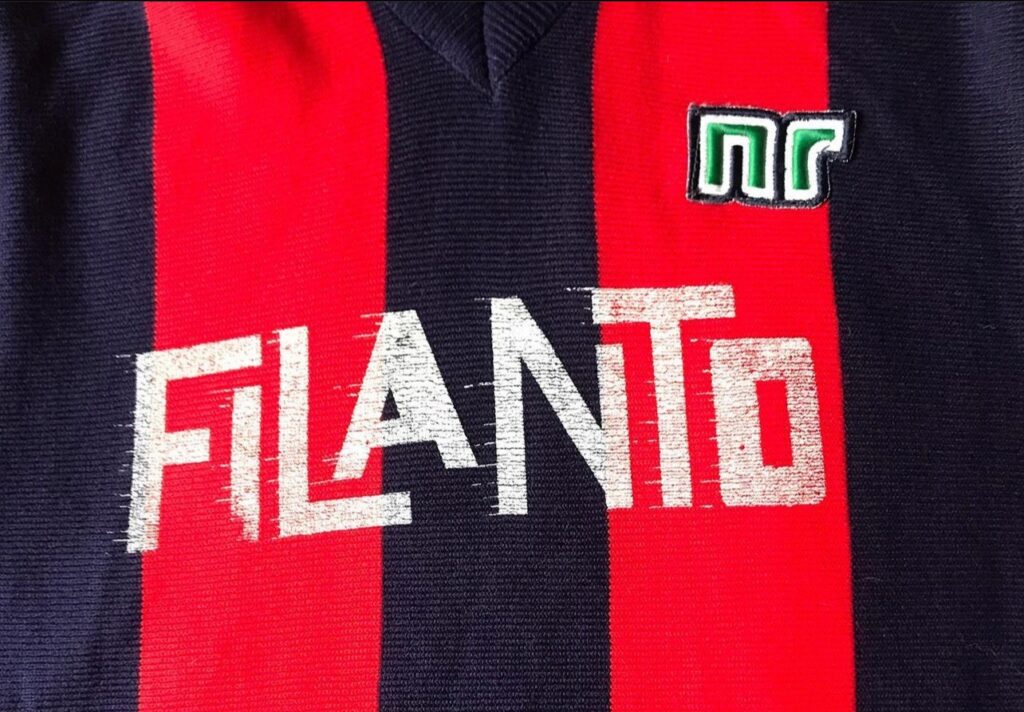La maglia, inutile dirlo, è stata prodotta da Ennerre ed è molto simile a quella prodotta per il Taranto per la stessa stagione: essa è infatti a manica lunga, in acrilico pesante ed a bande larghe rosso e blu e con il numero cucito in bianco sul retro. Maglia usata con ogni probabilità durante la stagione invernale. Da notare negli anni 80 che il colore della maglia era di un blu più scuro rispetto all’azzurro tradizionale delle maglie del club, tradizionalmente rossoazzurro. Lo sponsor è la famosa azienda di calzature Filanto, fondata dal presidente Filograna che fu al timone della società rossoazzurra dal 1978 al 1999; Filanto fu una delle prime realtà industriali del Salento e, oltre a fornire lavoro a molti operai locali, divenne uno dei maggiori produttori europei di calzature con una produzione giornaliera di circa 50.000 paia di calzature, un vero fiore all’occhiello dell’imprenditoria pugliese e meridionale.