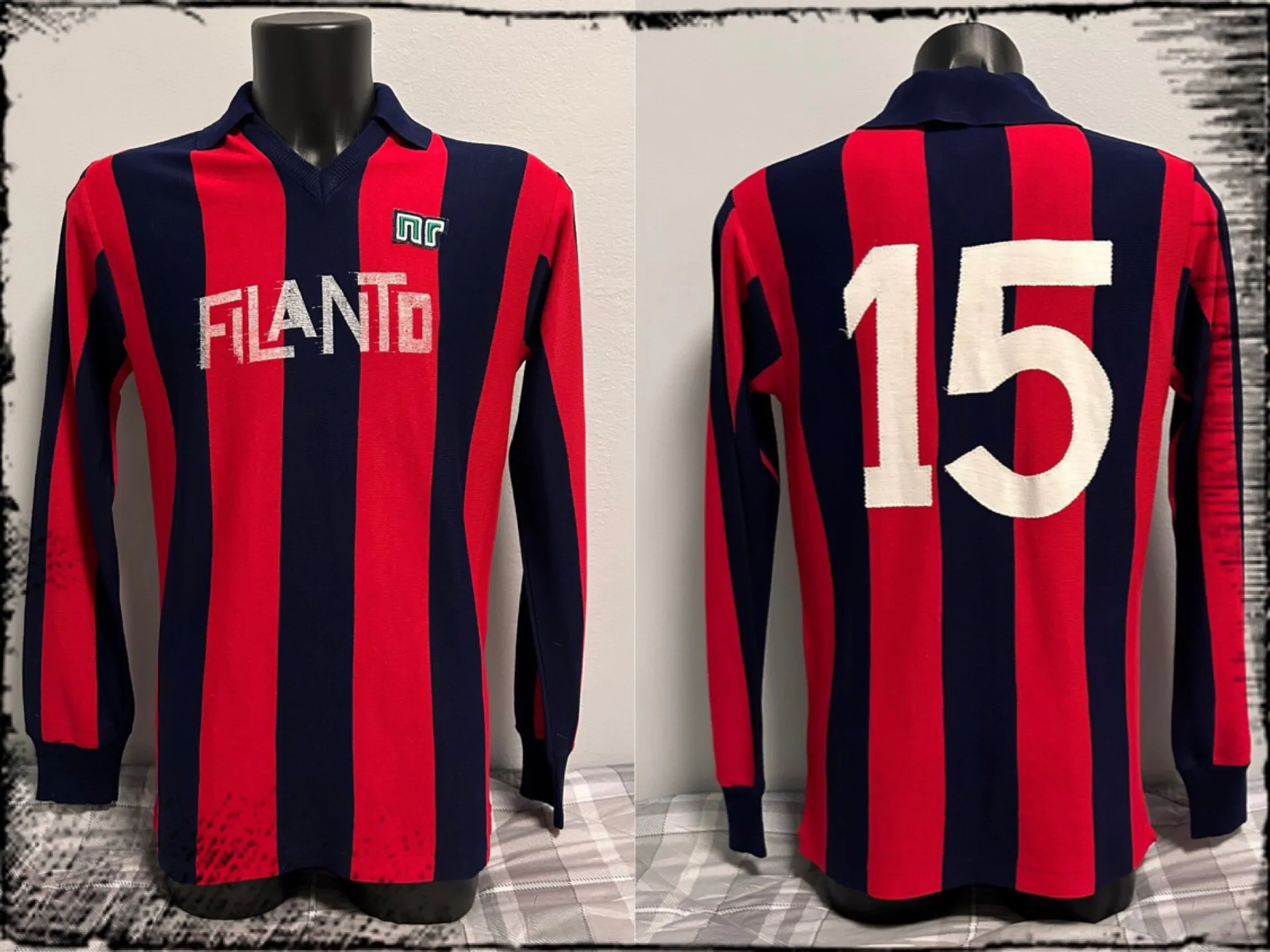 La maglia, inutile dirlo, è stata prodotta da Ennerre ed è molto simile a quella prodotta per il Taranto per la stessa stagione: essa è infatti a manica lunga, in acrilico pesante ed a bande larghe rosso e blu e con il numero cucito in bianco sul retro. Maglia usata con ogni probabilità durante la stagione invernale. Da notare negli anni 80 che il colore della maglia era di un blu più scuro rispetto all’azzurro tradizionale delle maglie del club, tradizionalmente rossoazzurro. Lo sponsor è la famosa azienda di calzature Filanto, fondata dal presidente Filograna che fu al timone della società rossoazzurra dal 1978 al 1999; Filanto fu una delle prime realtà industriali del Salento e, oltre a fornire lavoro a molti operai locali, divenne uno dei maggiori produttori europei di calzature con una produzione giornaliera di circa 50.000 paia di calzature, un vero fiore all’occhiello dell’imprenditoria pugliese e meridionale.