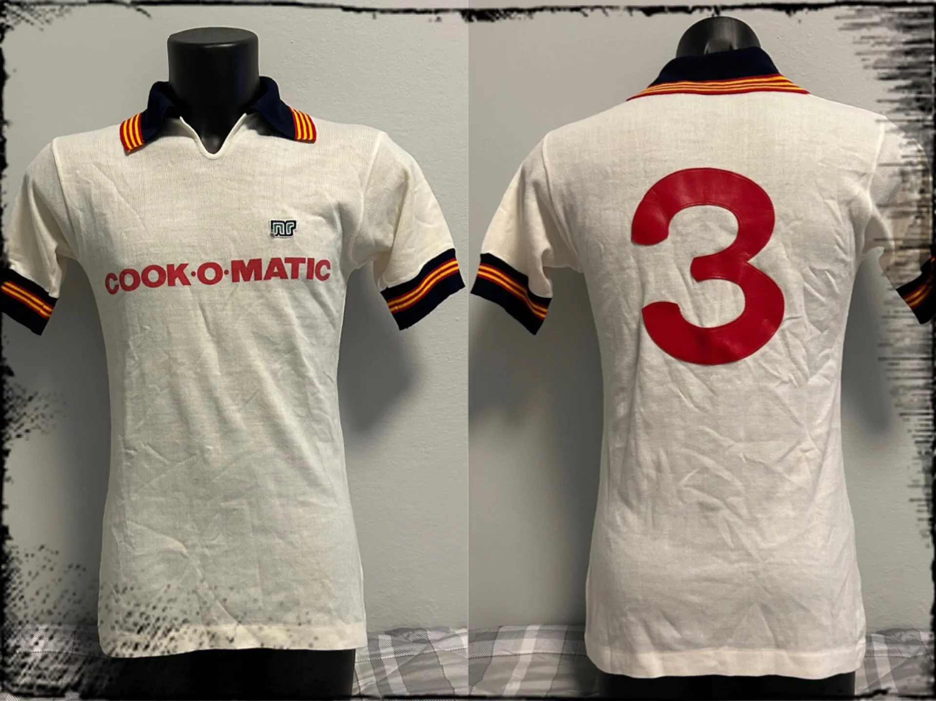 La maglia è una bellissima Ennerre New Line di fine anni Settanta in acrilico pesante (lanetta) con uno scollo alla base del colletto. La scritta del primo storico sponsor del Catanzaro, la nota marca di pentole Cook o Matic, fu, come detto, apposta successivamente in vernicetta di colore rosso. La cosa che più mi piace di questa maglia sono le strisce giallorosse presenti sul colletto e sui bordi manica per richiamare i colori sociali del club. Il logo della Ennerre è più piccolo rispetto a quello più comune, che sarà introdotto solo nei primi anni Ottanta. Ulteriore particolare che rende questa maglia davvero inimitabile è il numero 3 in similpelle: negli anni Settanta, la Ennerre infatti utilizzava ancora questo tipo di numerazione prima di passare a quella in panno. Grazie a Luca, senza il quale non sarei mai riuscito a prendere questa maglia!