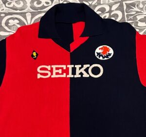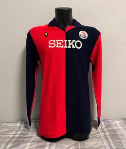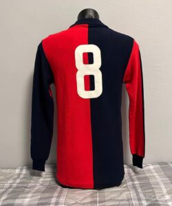 La maglia è tenuta benissimo dopo quarant’anni: è in acrilico pesante ed a manica lunga. Fu usata ovviamente per il periodo freddo della stagione e reca, in vernicetta di colore bianco, lo sponsor “Seiko”, la famosa marca giapponese di orologi, disposto orizzontalmente su tutta la maglia: esiste, infatti, un’altra versione della maglia di quella stagione con lo sponsor a carattere più piccolo, solo sulla parte blu della maglia. Seiko fu il primo storico sponsor del Grifone e restò sulle maglie rossoblù anche la stagione successiva.