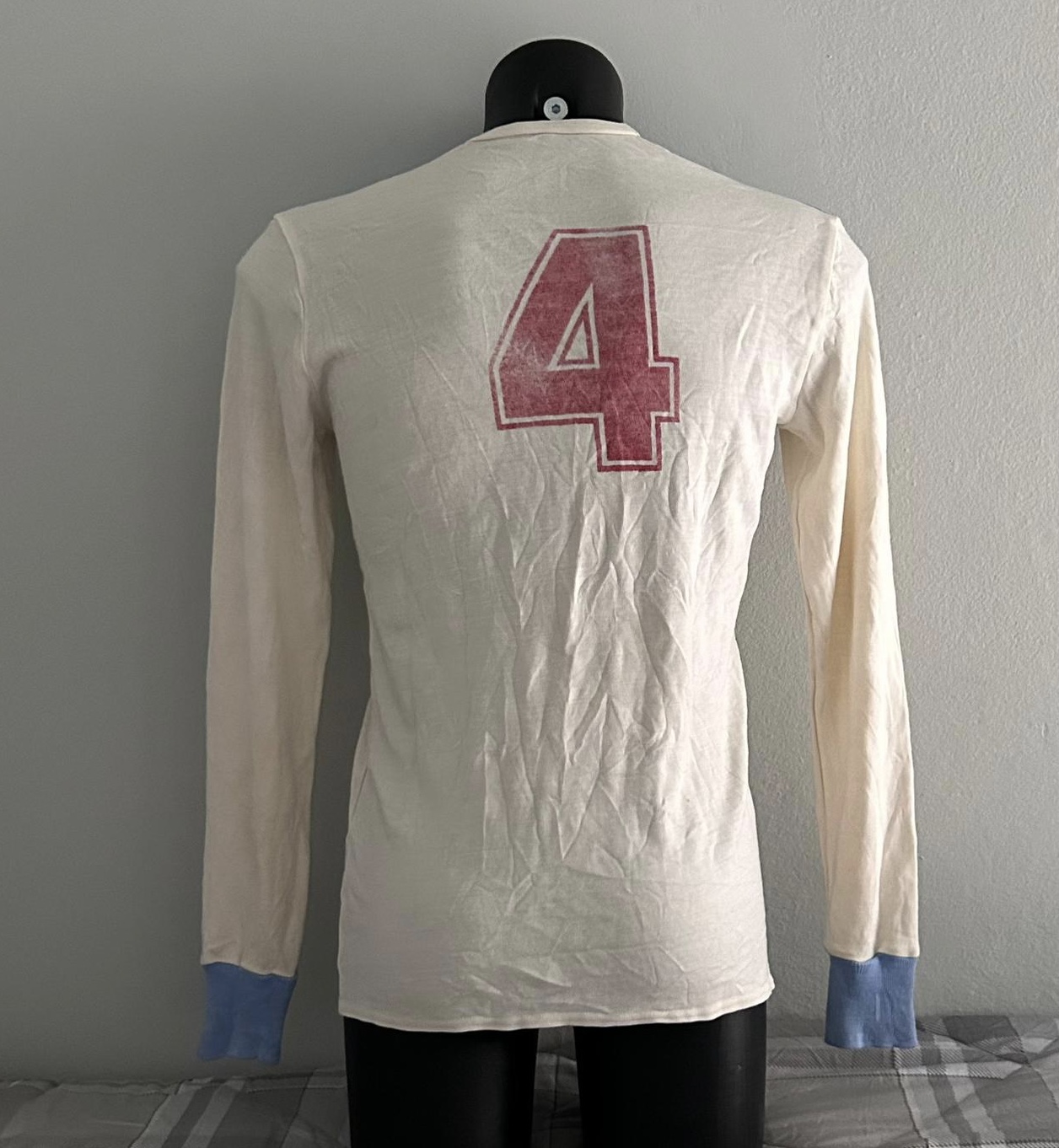 Il numero quattro è serigrafato in rosso e risulta un po’ consumato dai lavaggi a cui la maglia deve essere stata sottoposta.