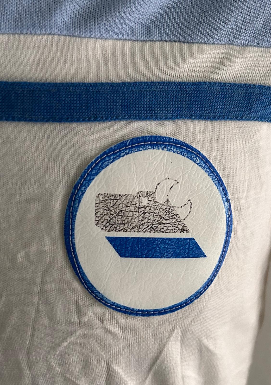 La maglia ha le caratteristiche del tutto simili a quelle già illustrate per la maglia del Taranto: anche questa ha lo scollo a V, una banda azzurra all’altezza delle spalle e una striscia orizzontale blu, il colore azzurro della banda superiore è richiamato anche dai polsini della maglia. Troviamo anche qui ovviamente il “pesciolino”, vale a dire la P di Pouchain ricamata in nero e a sinistra la toppa con lo stemma del Matera, anche in questo caso un animale, il bue stilizzato, anche questo disegnato da Piero Gratton, il simbolo della squadra e della città, presente nello stemma comunale che di seguito andremo a descrivere.
