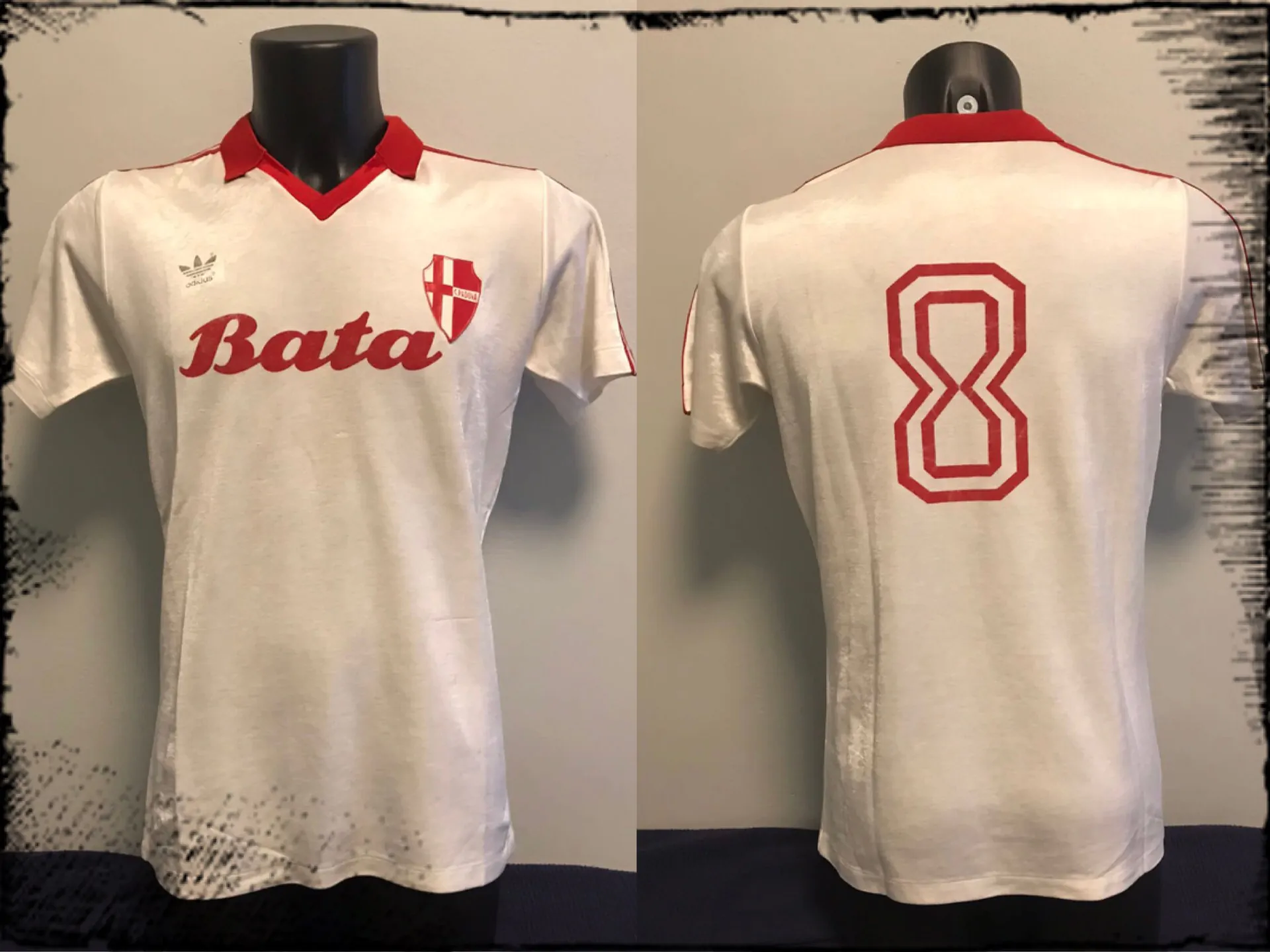La maglia, modello home, è una classica Adidas in cotone dei primi anni ’80 con bellissimo scudetto Padova plastifico e cucito sulla maglia; lo sponsor commerciale è Bata (importante marchio di scarpe fondato nell’allora Cecoslovacchia) che fu il primo storico sponsor del club a partire dalla stagione 1981-82 e fino al 1984-85; molto particolare è il numero 8 sul retro: di solito infatti per questo tipo di maglie è consuetudinario trovare il numero cubitale plastificato, su questa invece il font è diverso, non è cubitale ed è stampato in vernicetta sulla maglia proprio come lo sponsor.