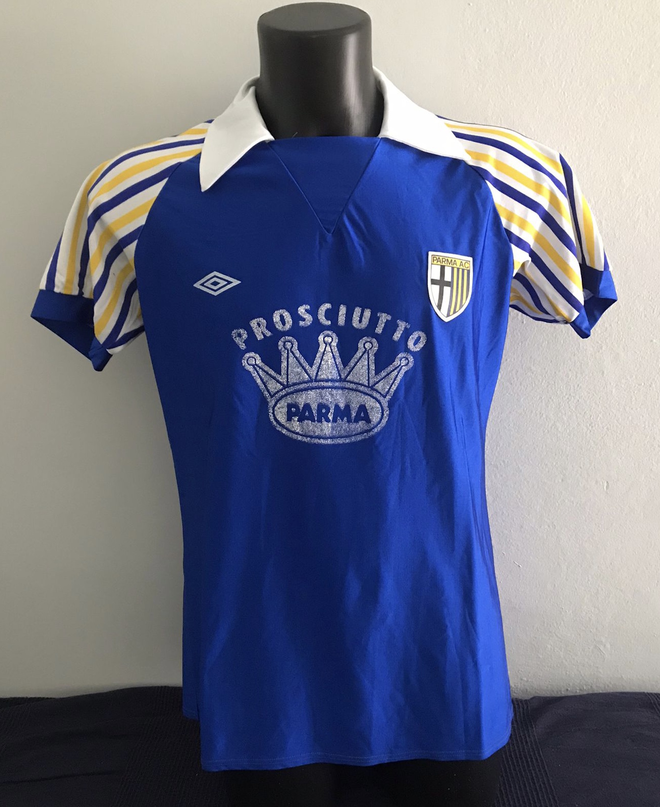 Si tratta di un modello raro, una maglia da trasferta che fu utilizzata anche nella trionfale trasferta vicentina che ho più sopra descritto. La maglia non è in lanetta (utilizzata fino all’anno precedente) ma in poliestere, più leggera quindi, caratterizzata dallo scudetto in plastica con bordino bianco, utilizzato solo per quella stagione e dal numero tridimensionale classico in plastichina. Lo sponsor commerciale è quello in vernicetta, il famoso Consorzio del Prosciutto di Parma. Queste maglie furono utilizzate solo nella seconda parte della stagione, mentre per la prima parte il Parma usò una muta diversa con maglie elasticizzate e numero all’americana.